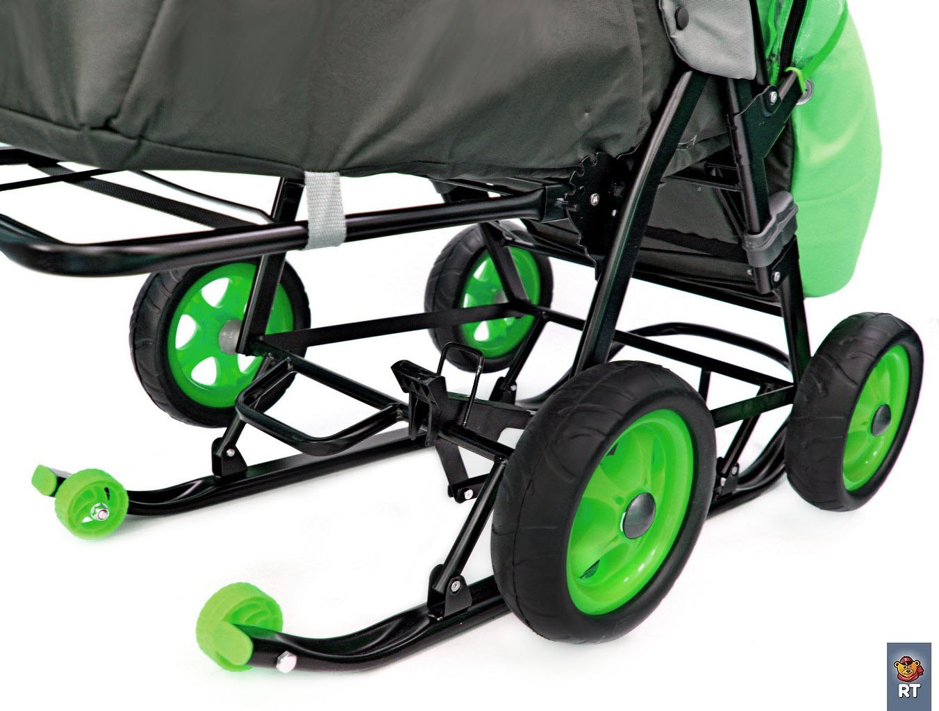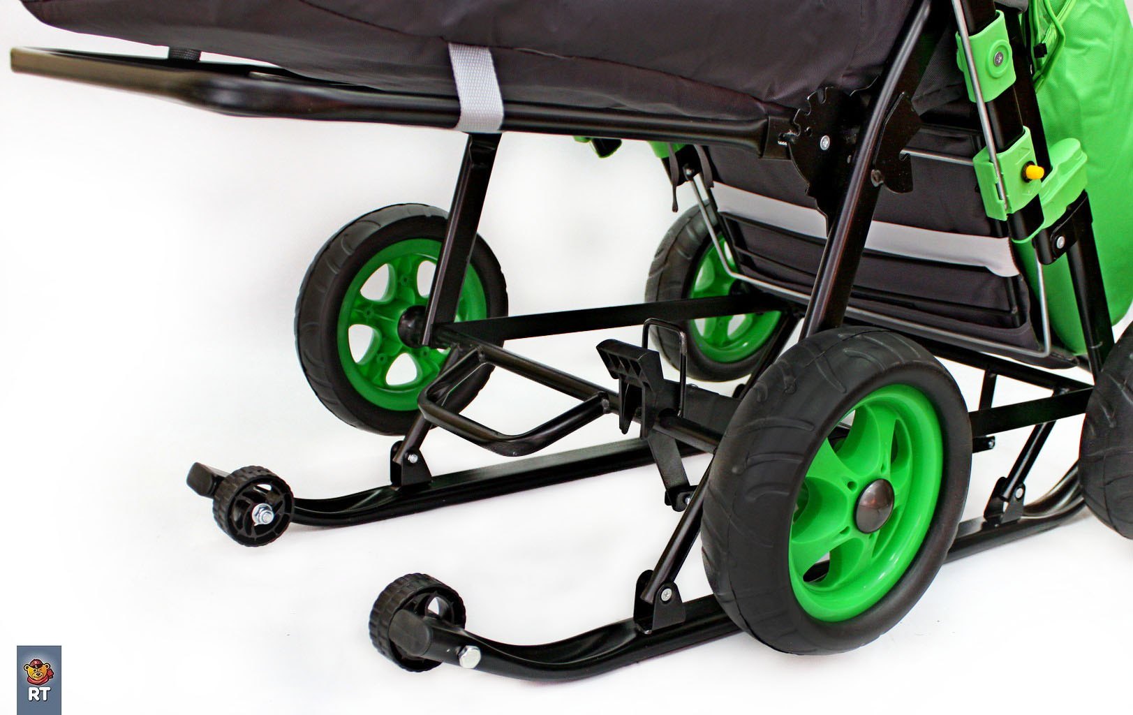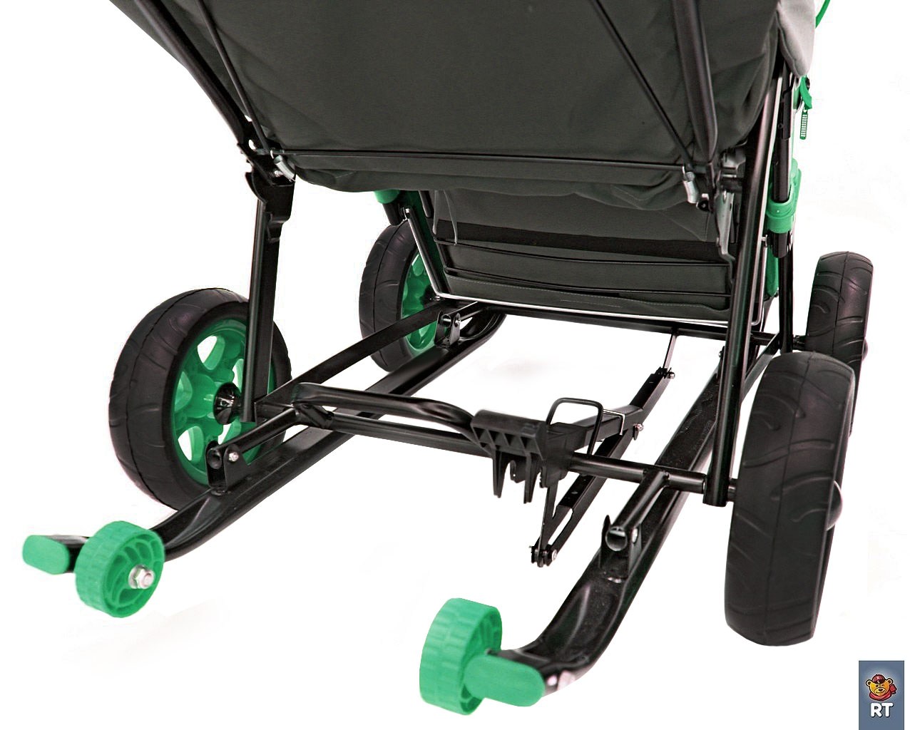 - 4 резиновых колеса и очень надежный педальный механизм. Переход с колес на лыжи и наоборот простым нажатием ногой.