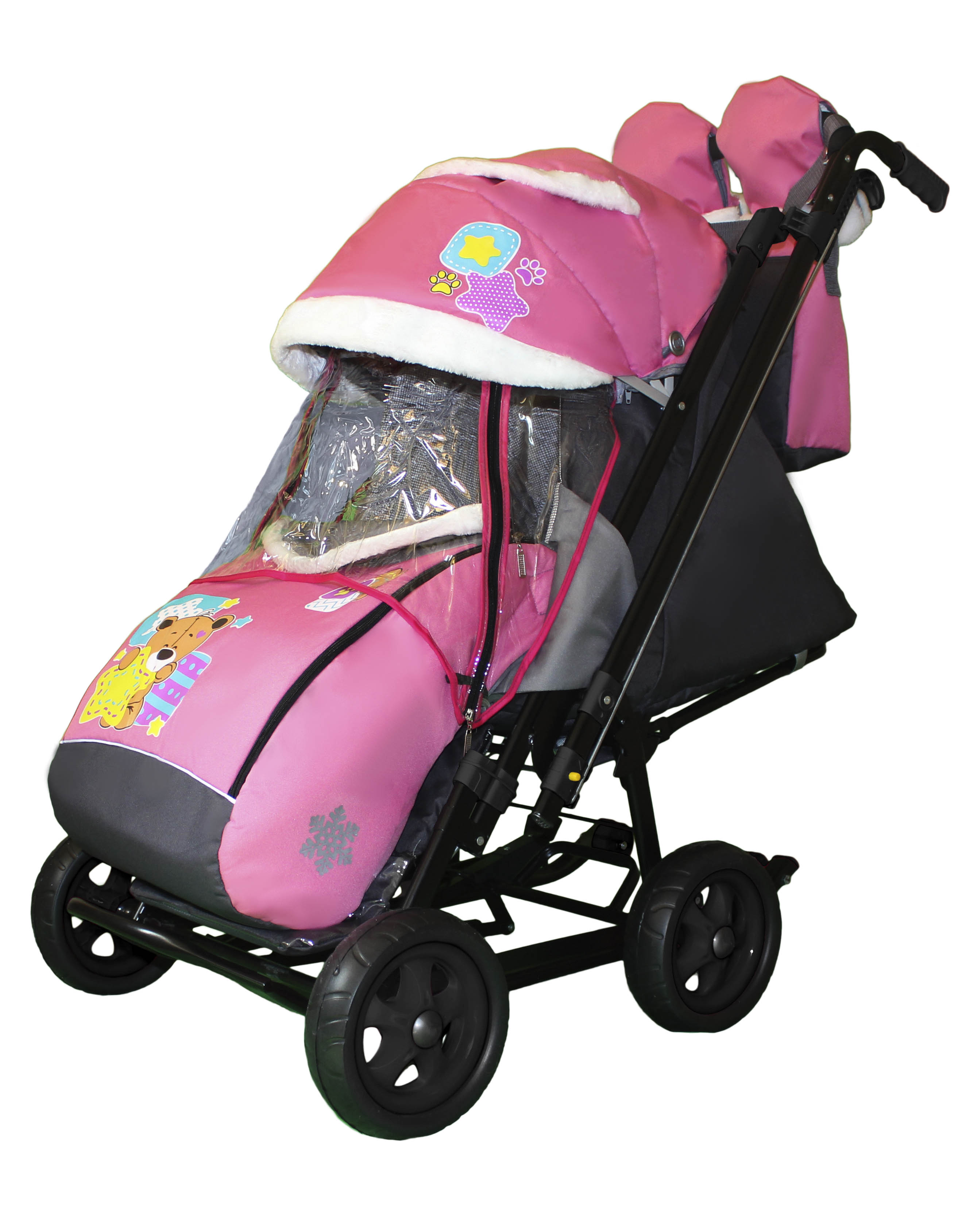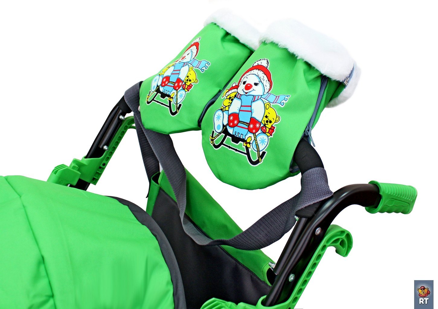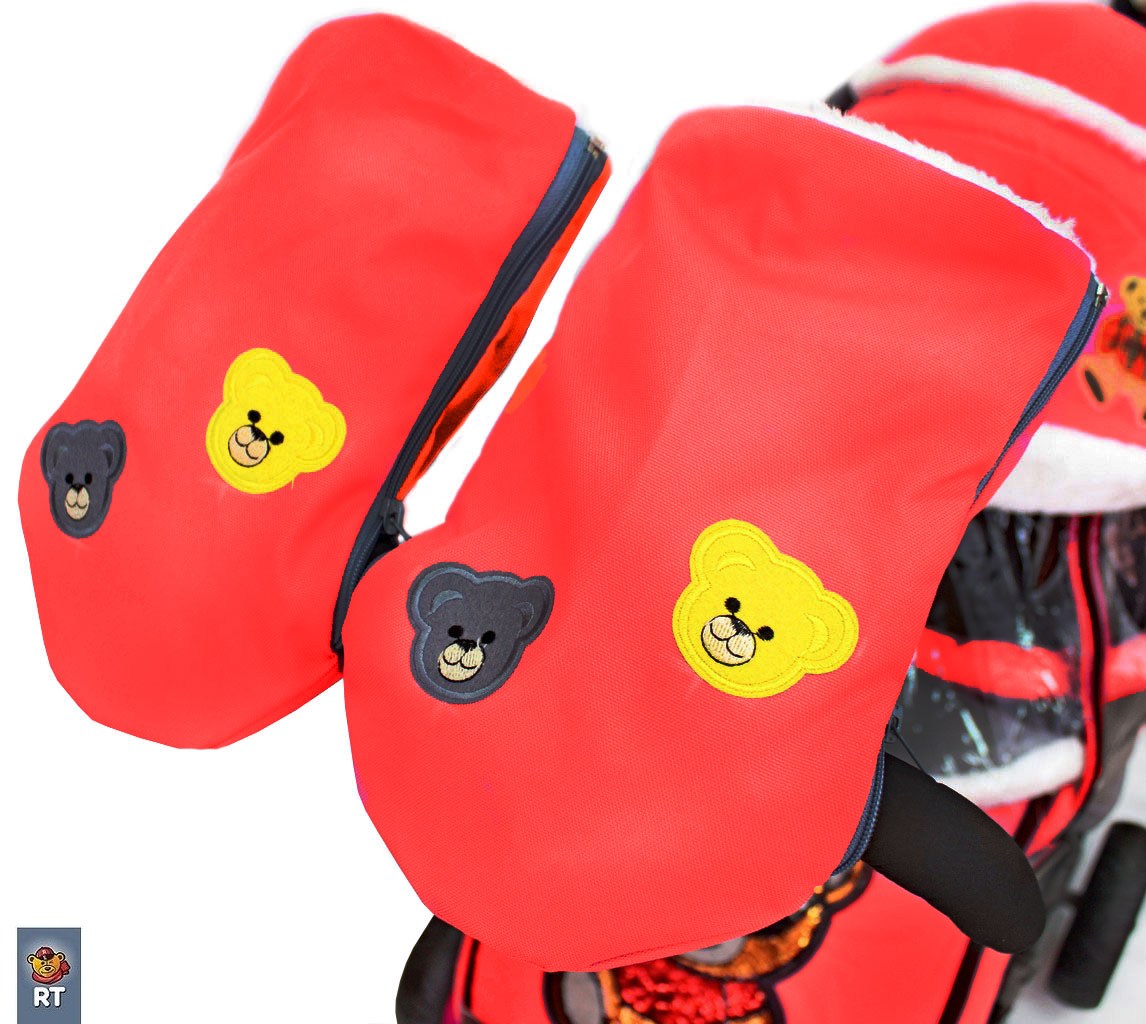В комплекте: вместительная сумка для мамы, очень стильная и созданная с любовью: внутри- множество карманов и меховые варежки для рук на стальных кнопках.