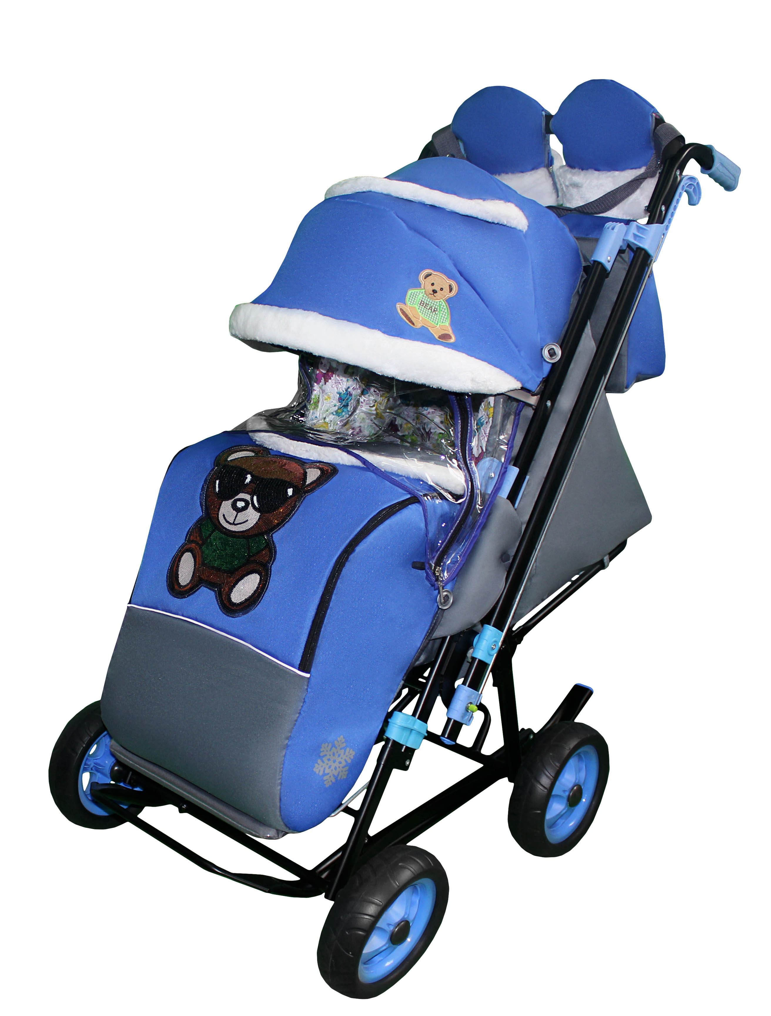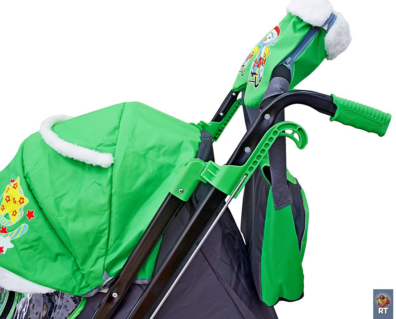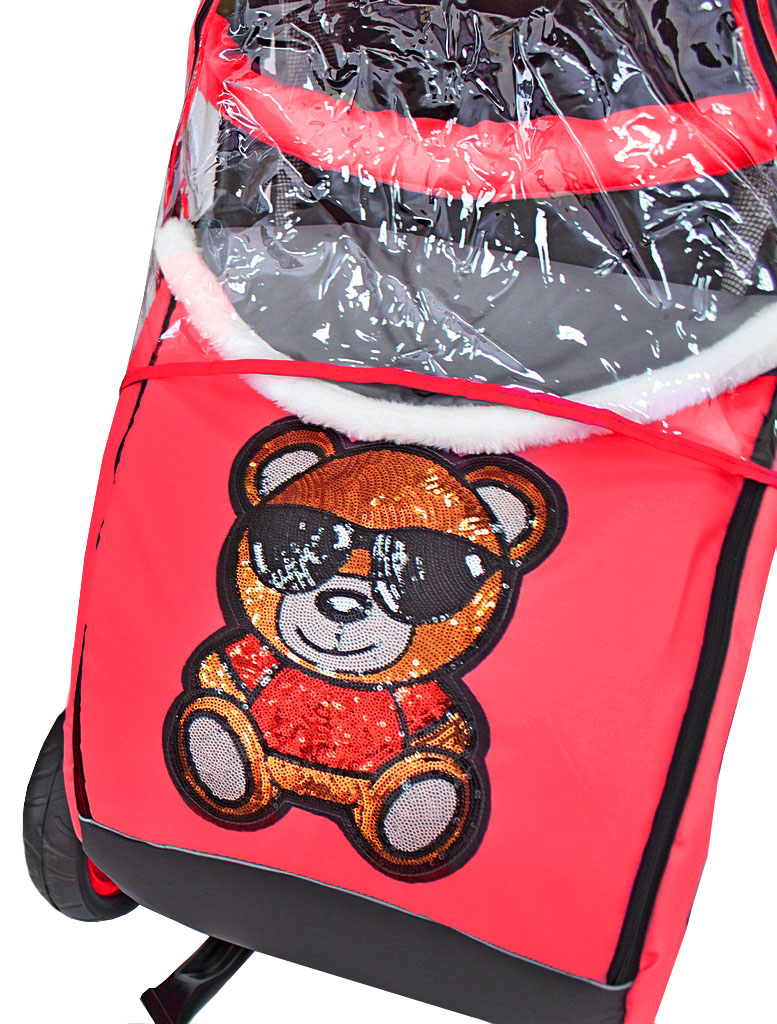 - Съемный прозрачный тент от ветра и дождя с двумя молниями, крепится к чехлу коляски на пуговицу для исключения продувания.