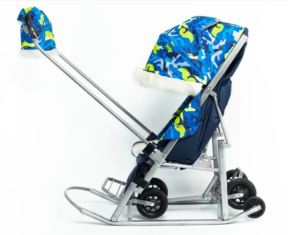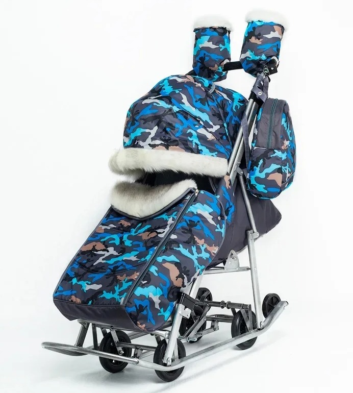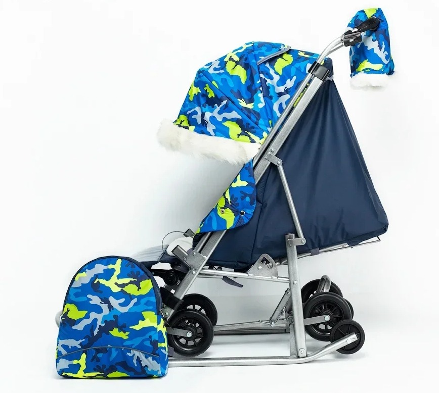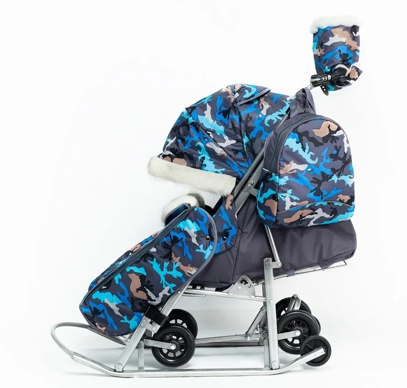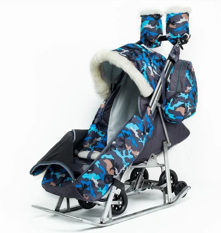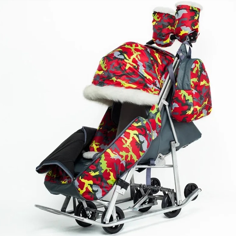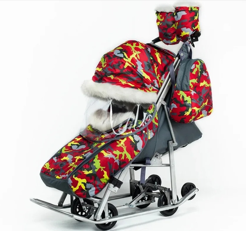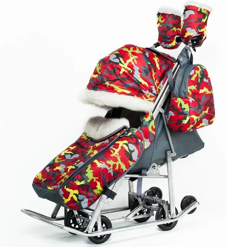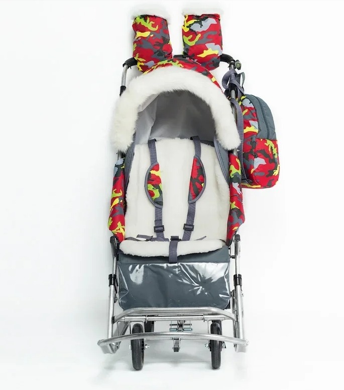 Санки -коляска Pikate Military (Пикате Милитари) - обновленный дизайн популярной модели с новыми расцветками камуфляжа и фонариком в комплекте. Санки коляска рассчитаны для ребенка от 6 месяцев до 3-4 лет, а за счет полностью горизонтальной спинки могут использоваться для детей более раннего возраста. Как и в полноценной коляске предусмотрено 3 положения спинки, регулируемая подножка, 5-ти точечные ремни безопасности и мягкий матрасик увеличенных размеров. От непогоды ребенка защитит большой капюшон со смотровым окошком для мамы, накидка на ножки с быстрым доступом к ребенку. Дополнительно во время снега можно использоваться специальную шторку -ветровик из силикона. Яркие расцветки и белоснежный мех на капюшоне и накидке на ножки смотрится очень красиво и необычно. Для комфорта мамы предусмотрены теплые варежки в цвет санок и стильный рюкзачок.