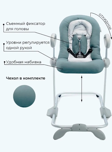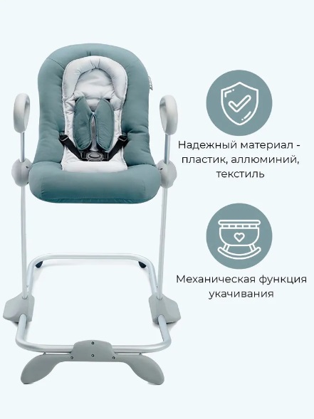 Шезлонг имеет возможность укачивания ребенка с помощью специальных полозьев. Так же эта функция надежно фиксируется, если укачивание в данный момент не актуально.