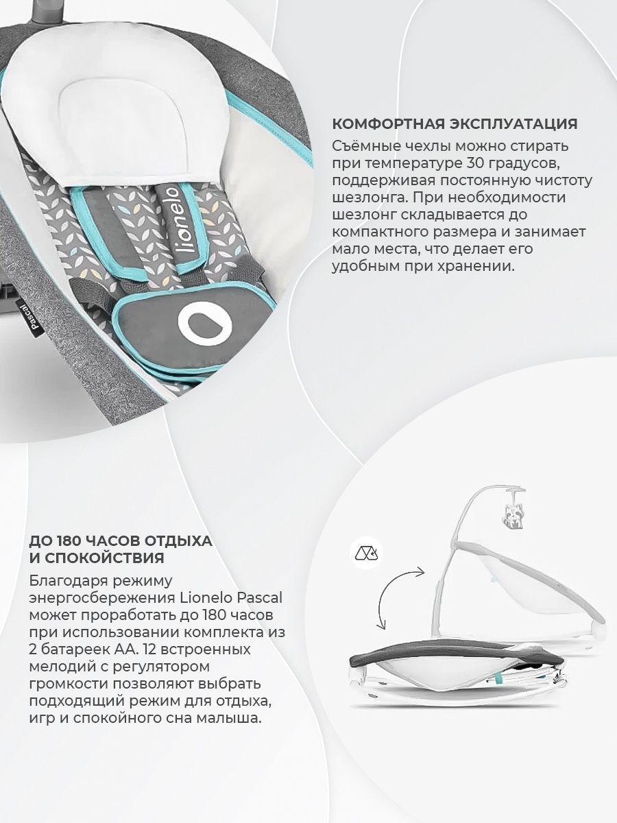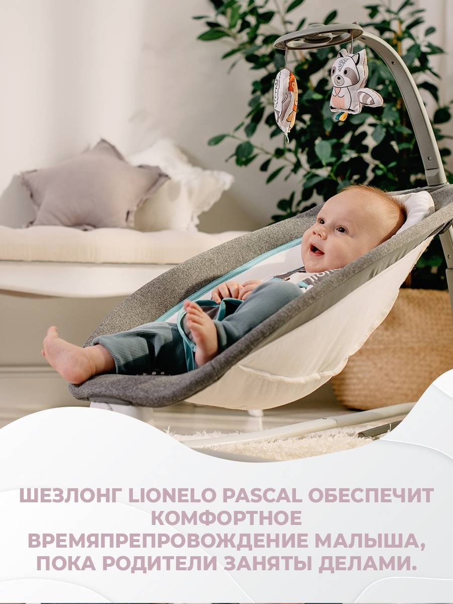 Шезлонг Lionelo Pascal (Лионело Паскаль) - очень стильный, удобный шезлонг для ребенка с рождения. Продуманный функционал модели позволит вам наслаждаться общением с ребенком в удобном для него "кресле". 4 наклона спинки позволит настроить шезлонг под интересы малыша, он может спать , играть, и удобно наблюдать за родителями. Шезлонг оснащен приятной музыкой, легкой вибрацией и интерактивной игровой дугой. В сложенном виде модель очень компактна и не занимает много места.