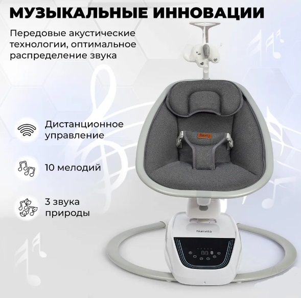 Развлекательный момент тоже учтен: электронные качели для новорожденных умеют проигрывать мелодии и звуки природы, а в комплект входит дуга с игрушкой: в минуты бодрствования малыш сможет фиксировать на ней свой взгляд, тренируя зрение, а также тянуть к ней ручки, развивая тем самым моторику. И музыкой, и таймером, и режимами укачивания можно управлять как при помощи сенсорной панели, так и с использованием пульта дистанционного управления.