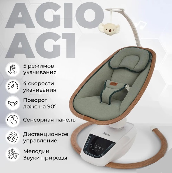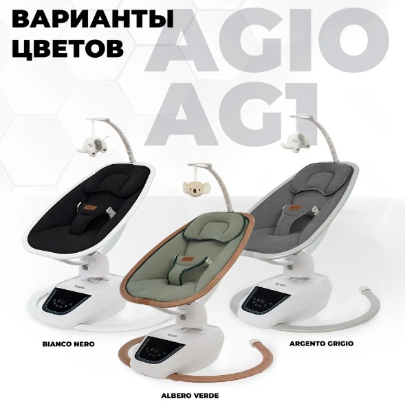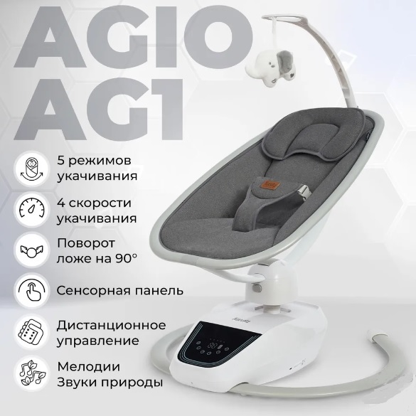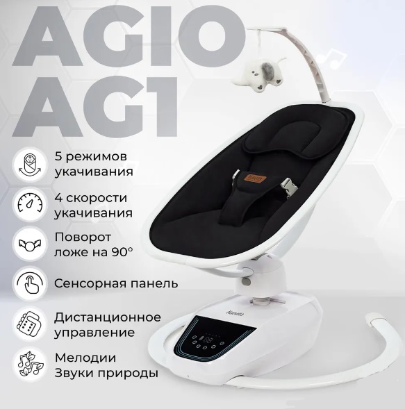 Из других преимуществ электронной качели для новорожденных Agio AG1 — возможность регулировки наклона сиденья: от 103° (с углом наклона спинки в 120°) до 113° (с углом наклона спинки в 130°). Электрокачель-шезлонг рассчитана на новорожденных младенцев в возрасте от 0 до 6 месяцев, а значит, эта характеристика имеет для них принципиальное значение: в период, когда мышцы и связки малыша слабы и несовершенны, физиологически правильное положение тела особенно важно.