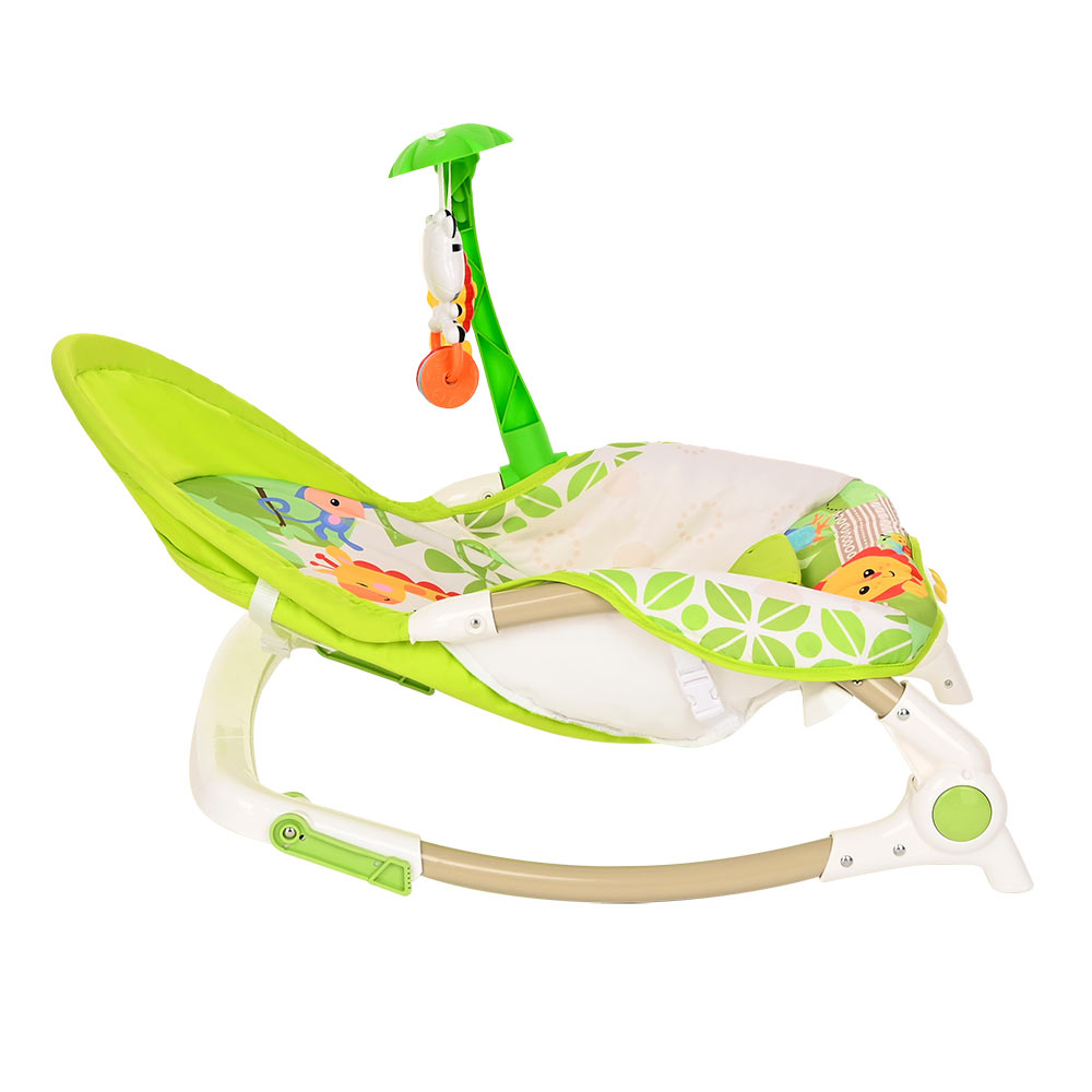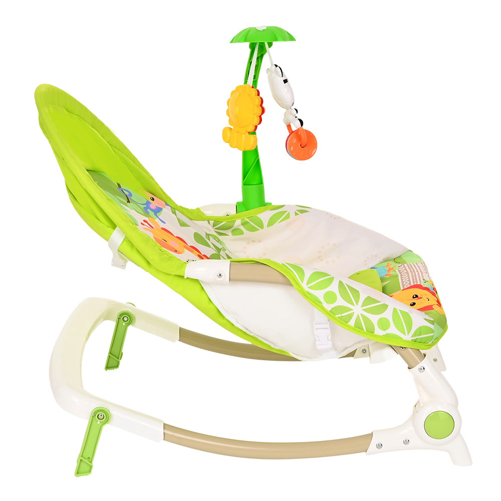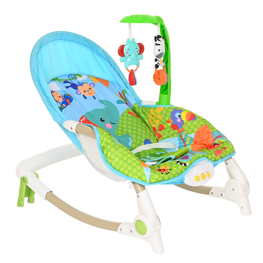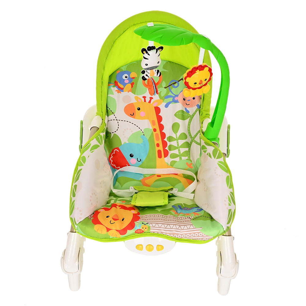 Большое преимущество данного шезлонга в том, что помимо комфортного сидения в кресле, в отличие от многих традиционных шезлонгов, ребенок может наслаждаться приятными мелодиями, играть с подвешенными игрушками и плавно покачиваться.