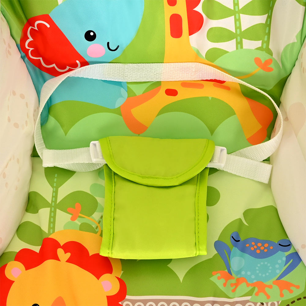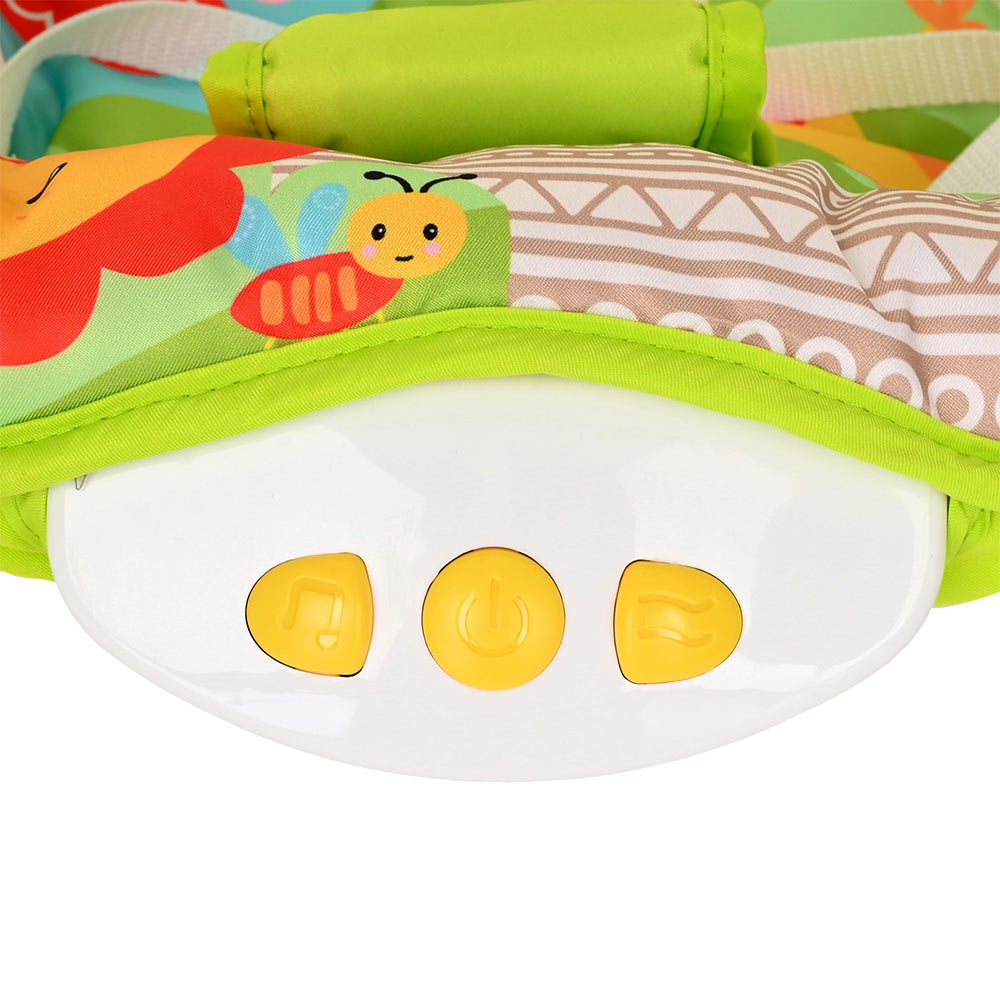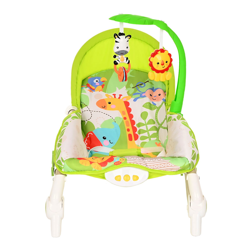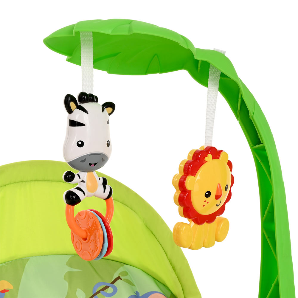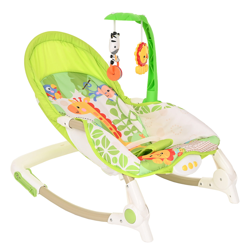 Большое преимущество данного шезлонга в том, что помимо комфортного сидения в кресле, в отличие от многих традиционных шезлонгов, ребенок может наслаждаться приятными мелодиями, играть с подвешенными игрушками и плавно покачиваться.