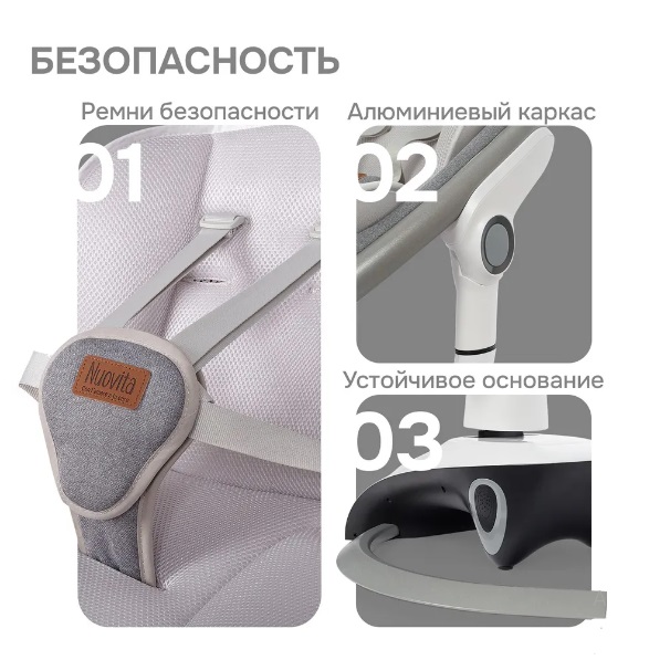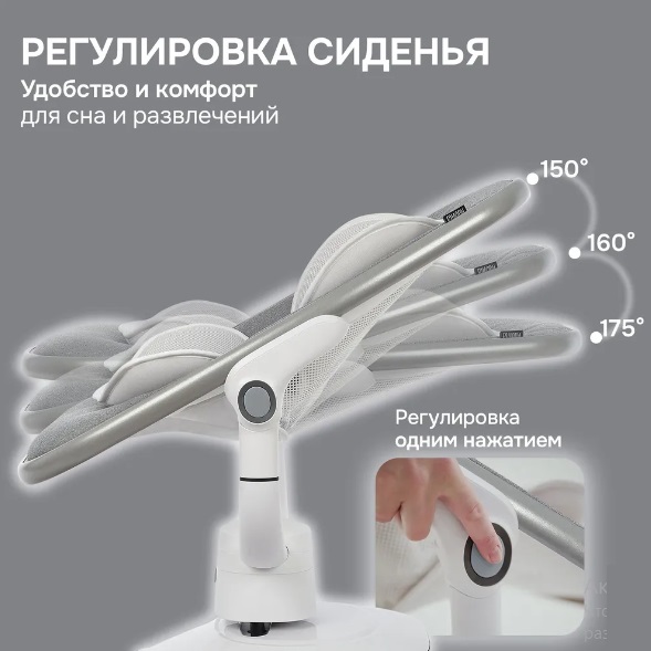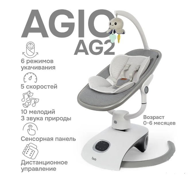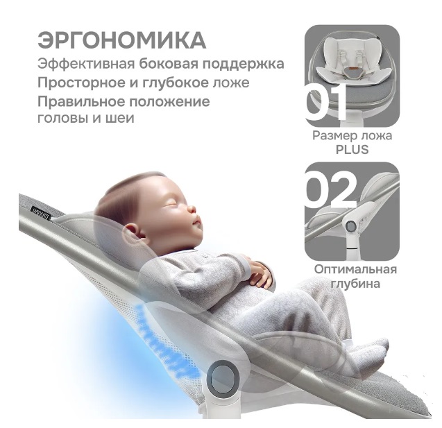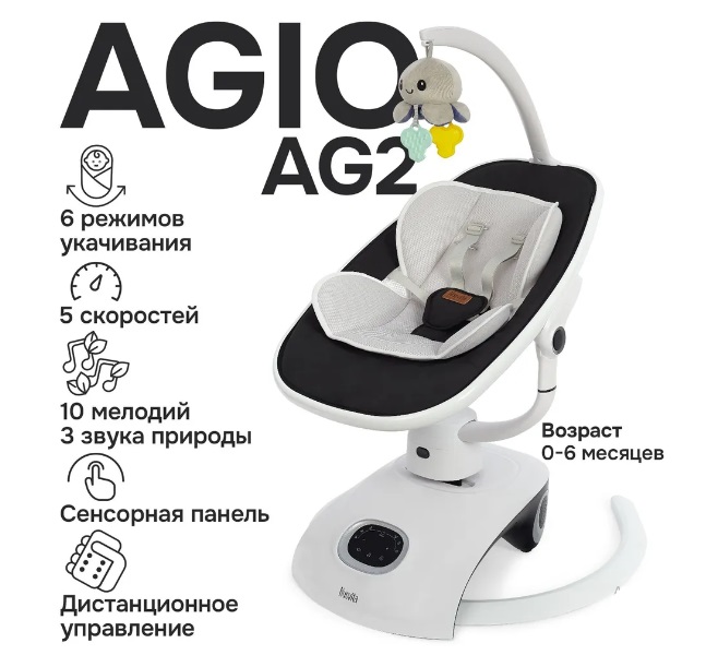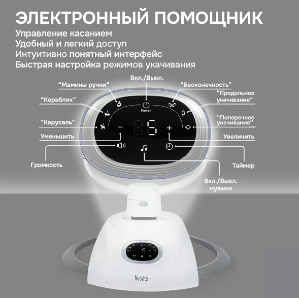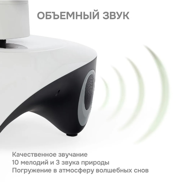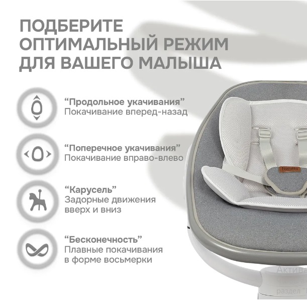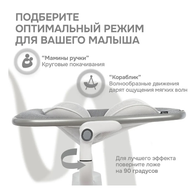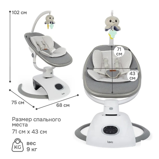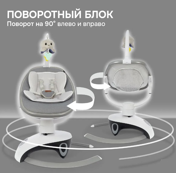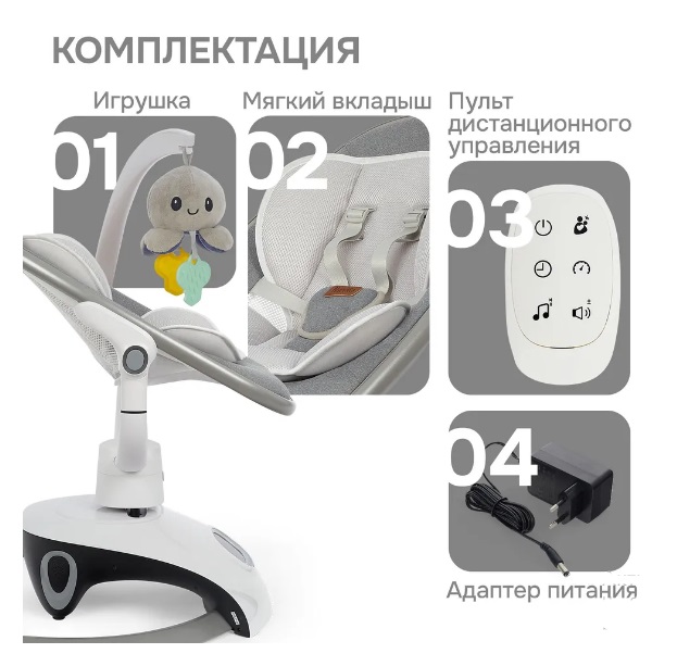 В комплекте: Электрокачель, вкладыш, адаптер питания, подвесная игрушка, пульт ДУ.