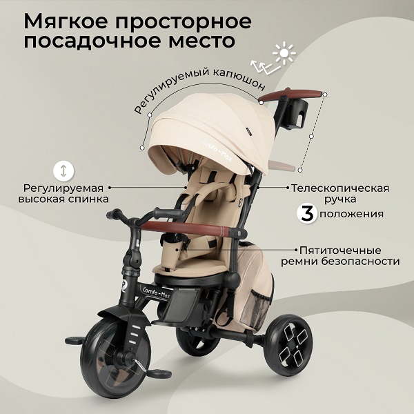 Комфортное поворотное сидение с наклоном спинки и удобной подножкой для маленьких ножек позволит заменить коляску в теплое время года. Родительская ручка легко управляет велосипедом, а большое количество аксессуаров, как рюкзачок, подстаканник сделают прогулку еще более комфортной.