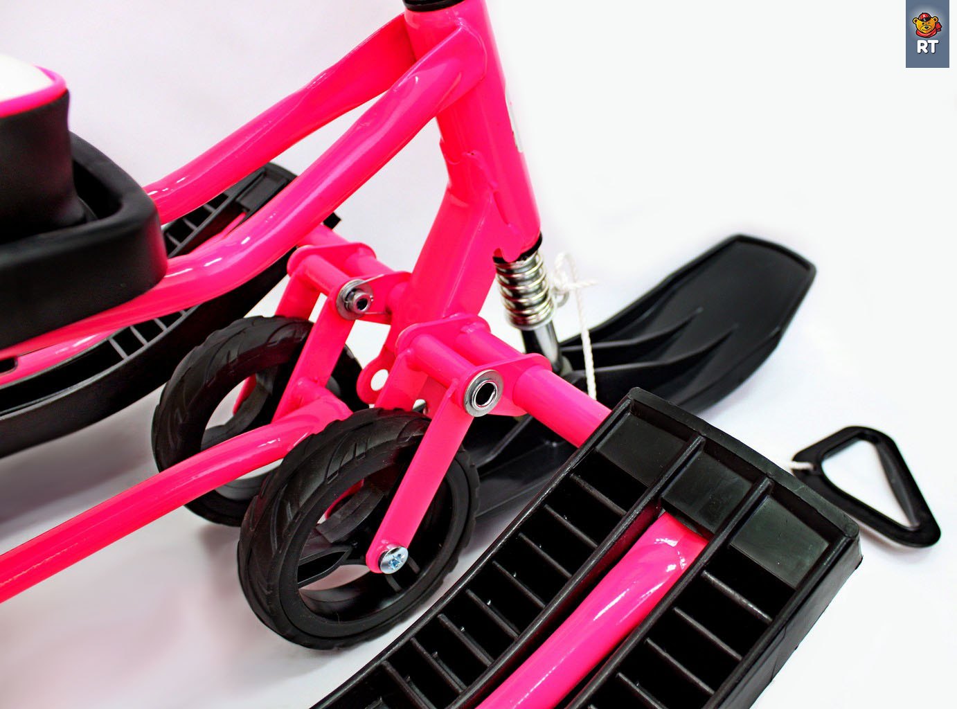Снегокат оснащен большими колесами из литой резины. Они легко выдвигаются и задвигаются при необходимости. Идеальный вариант для города, где снег чередуется с дорогами, и без колес снегокат пришлось бы нести на руках.