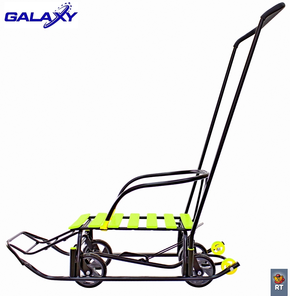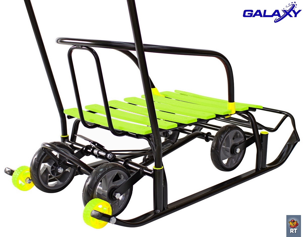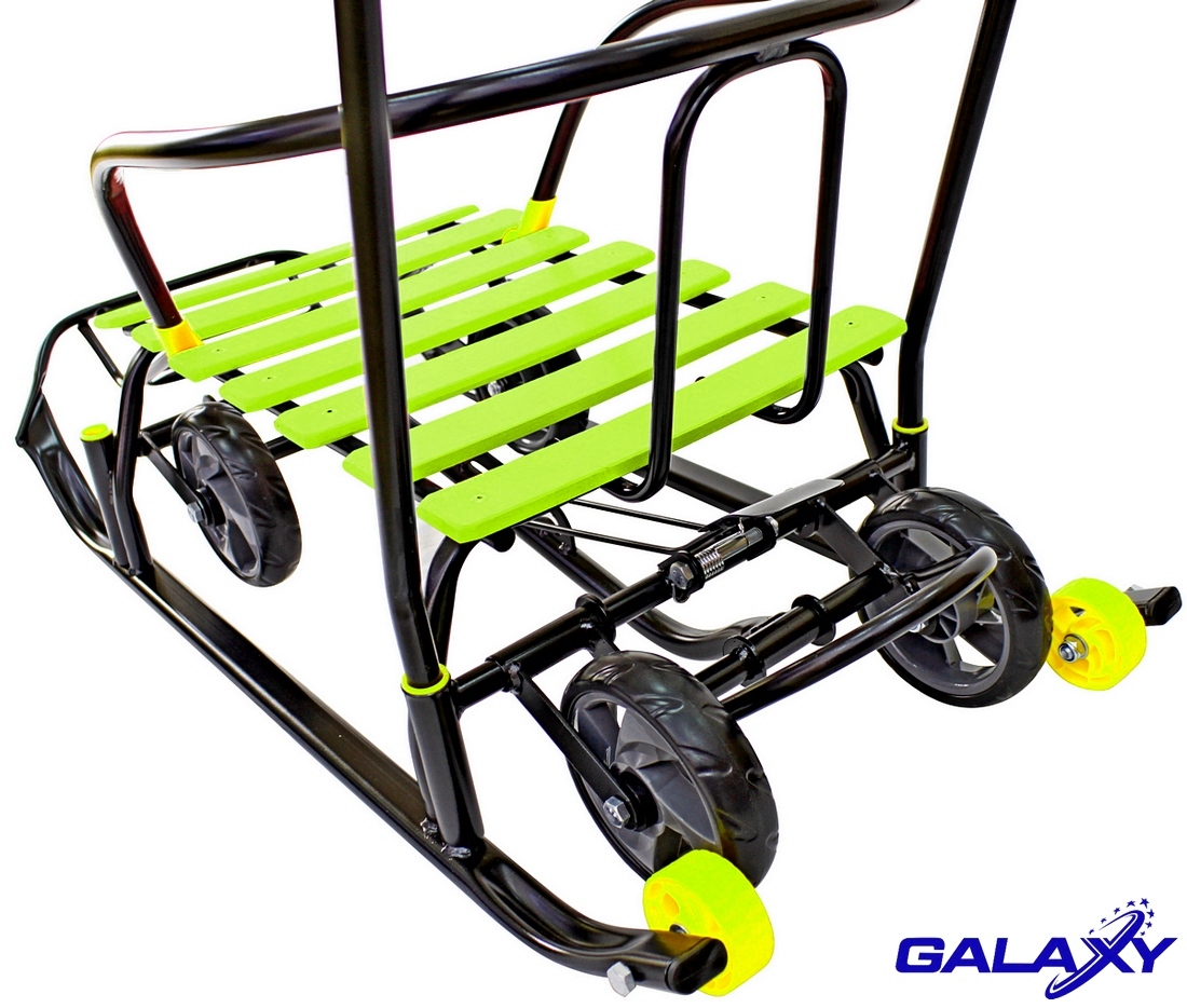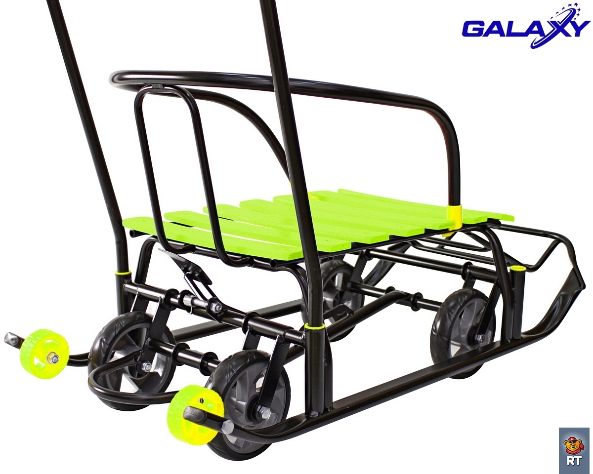 Снегомобиль Snow Galaxy Black Auto (сноу гелакси блек авто) - санки с большими резиновыми колесами и деревяными рейками для ребенка от года до 5 лет. Это не просто санки, это удобная модель с возможностью в любой момент выдвинуть колеса и заехать в магазин, проехать через дорогу, или просто по асфальту. Вы станете более мобильны, и не будете сильно зависить от количества выпавшего снега и степени чистки дорог. Так же большим преимуществом данной модели является ручка -толкатель для родителей. Она позволит везти санки спереди и наблюдать за ребенком во время движения, что очень удобно и более безопасно для перевозки малышей. При использовании санок с колесами (как коляску) ручку толкатель можно устанавливать в 2-х направлениях: по ходу движения и против хода движения.