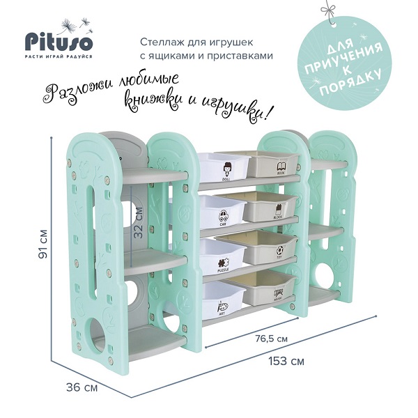 PITUSO Стеллаж для игрушек с ящиками и приставками(2 книжные),4 полки