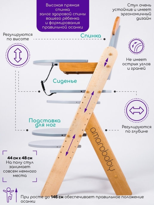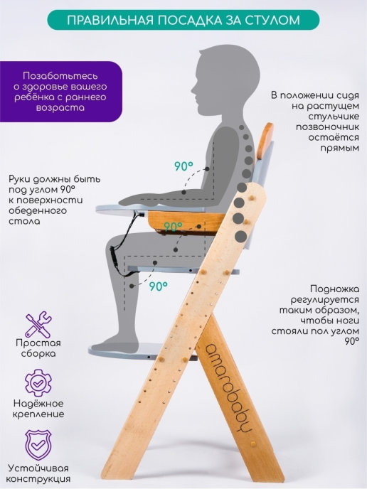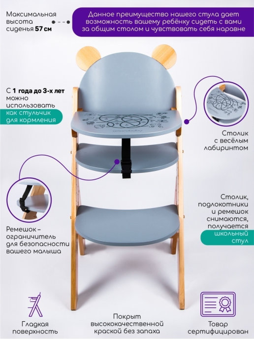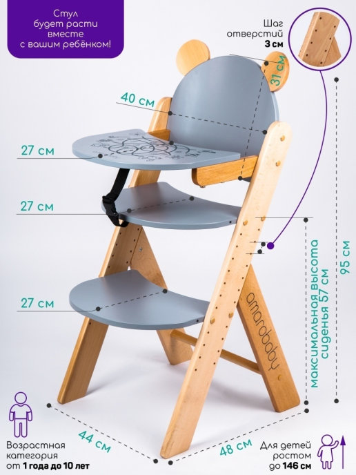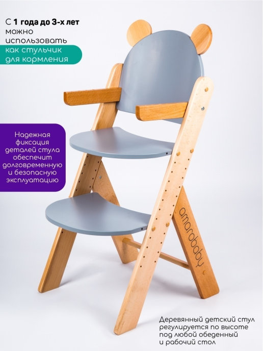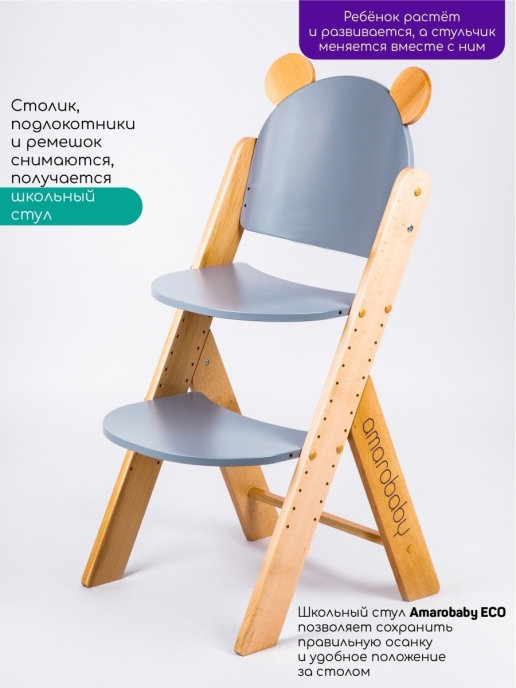 С года до трех лет можно использовать как стульчик для кормления. Удобная посадка стула, столик с веселым лабиринтом и ремешок-ограничитель для безопасности вашего малыша, все продуманно! Два дизайна деревянного стульчика для кормления CROWN и BEAR для маленьких принцесс и медвежат не оставят равнодушными ни одну маму. Три стильные расцветки с легкостью впишутся в любой интерьер. Ребенок растет и развивается, а стульчик меняется вместе с ним. Столик, подлокотники и ремешок снимаются, получается школьный стул. Деревянный детский стул регулируется по высоте под любой обеденный и рабочий стол. Школьный стул Amarobaby ECO позволяет сохранить правильную осанку и удобное положение за столом. Надежная фиксация деталей стула обеспечит долговременную и безопасную эксплуатацию.