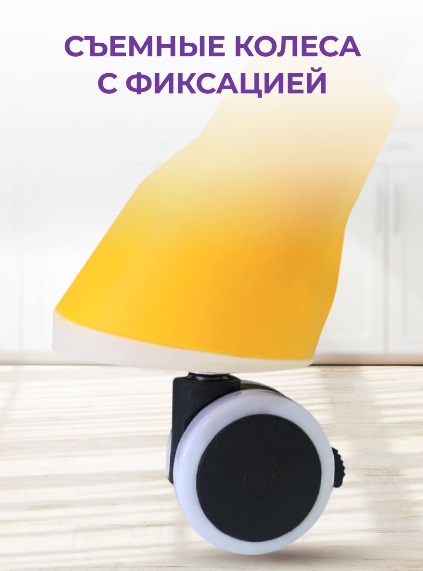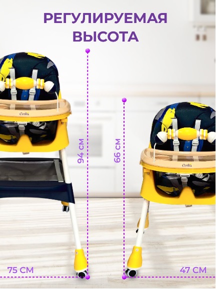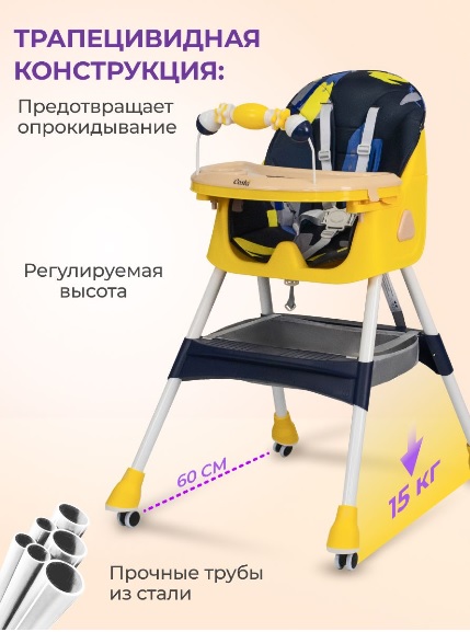Стульчик имеет трапецивидная конструкция, что предотвращает опрокидывание стульчика и максимальную устойчивость. Стульчик оснащен удобными ножками из стали, которые можно регулировать по высоте, делая стульчик высоким - для кормления ребенка или низким- для игр и занятий. Стульчик имеет удобные колеса со стопорами, которые при необходимости легко снять, сделав стульчик еще более устойчивым и неподвижным.