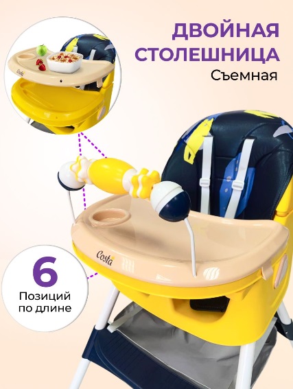 Стульчик оснащен съемным, легкомоющимся столиком с подносом. Столик регулируется по глубине, чтобы ребенку было комфортно. Дополнительно на стульчик можно установить игровую дугу, чтобы развлечь ребенка до или после еды.