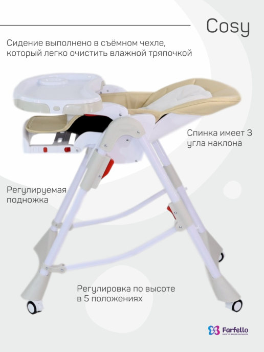Стул для кормления Farfello Costa Cosy (Фарфелло Коста Коси) - красивый, качественный стул для кормления ребенка от 6 месяцев до 3-4 лет. У стула удобные регулировки, которые помогут маме сделать кормление ребенка максимально удобным. Регулируется наклон спинки стульчика, высота сидения , глубина столика с подносом, подножка. Чехол стульчика выполнен их качественного заменителя кожи, а для малышей предусмотрен дополнительный текстильный матрасик. Вся обивка у стульчика съемная и легко стирается.