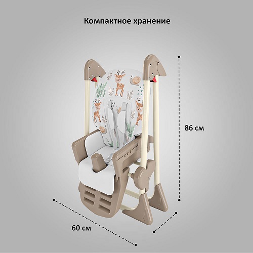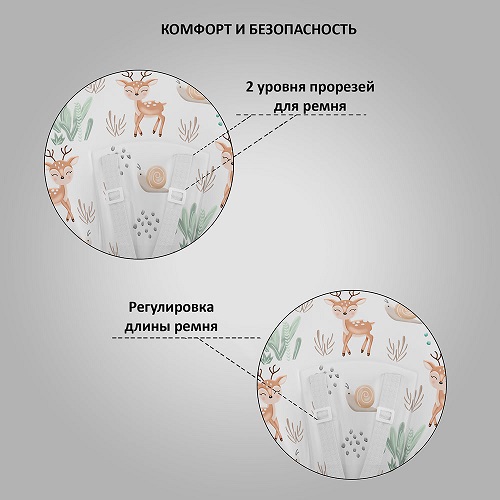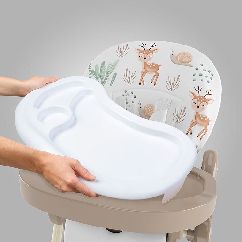 Стул оснащен моющимся чехлом с красивым детским рисунком. Малышу будет приятно сидеть в окружении зайчат, оленят или других милых зверей. После еды стульчик легко протирается влажными салфетками. А при сильных загрязнениях чехол можно снять и постирать в стиральной машине в бережном режиме.