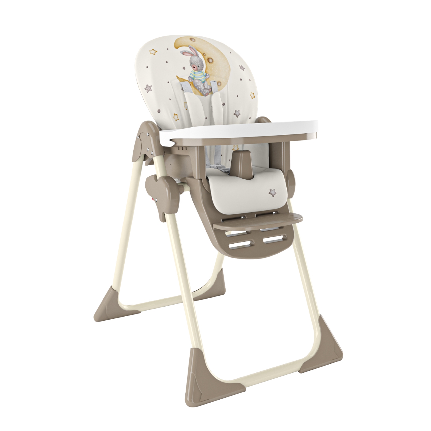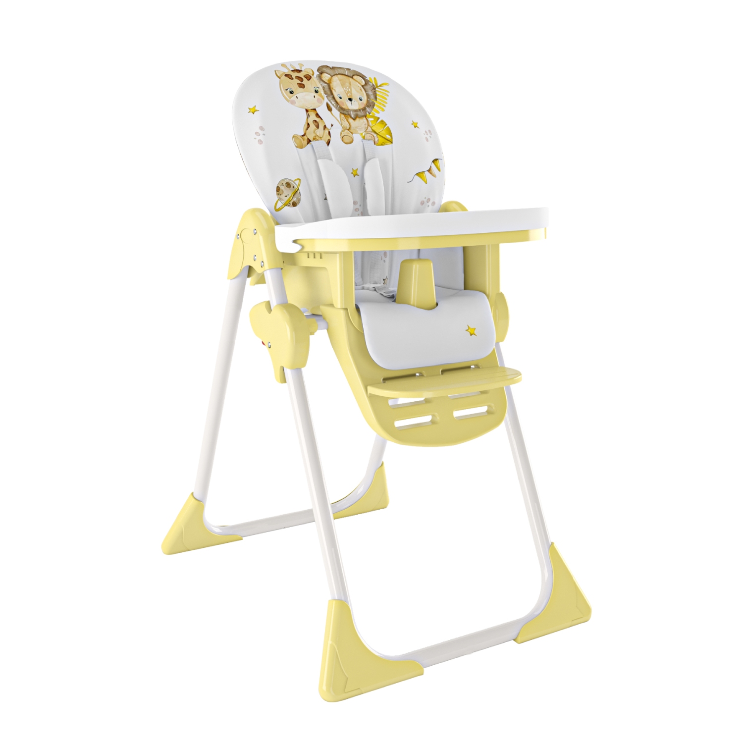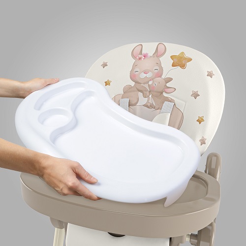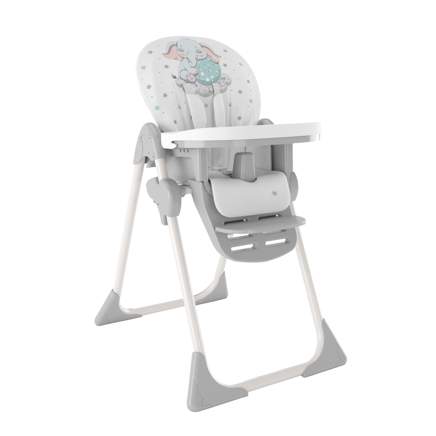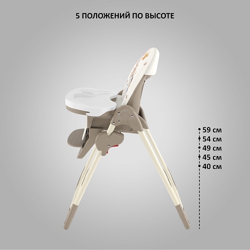 Он регулируется по высоте в пяти положениях – удобно опускается вниз по передней стороне крепкой металлической опоры. Это позволяет посадить ребенка к столу вместе со взрослыми или опустить кресло на комфортный уровень, чтобы ребенок мог забираться туда самостоятельно. Трехточечные ремни безопасности соединяются в надежном замке. Пластиковый упор между ножек является дополнительным средством защиты подвижного малыша и не позволит сползти вниз.