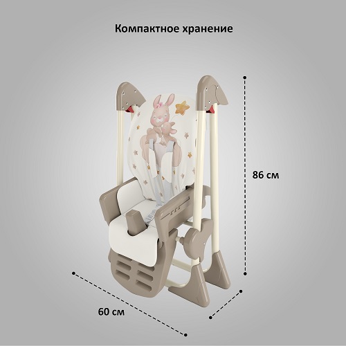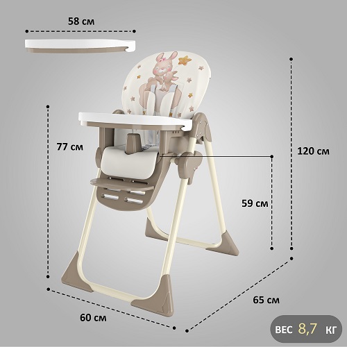 Имеется удобный съемный столик с бортиками и дополнительный поднос с углублением для стаканчика и ложки. По глубине он имеет три уровня установки. Стул не тяжелый и в сложенном виде занимает мало места. Пластиковые уголки на ножках добавляют устойчивости и защищают пол от царапин.