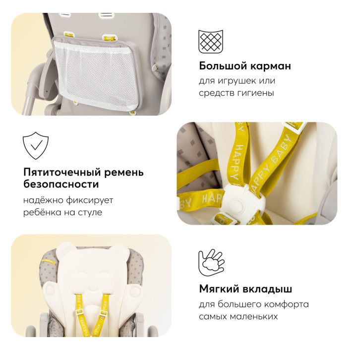 Детский стул Happy baby WILLIAM PRO (Хеппи беби вильям про ) - стул, который покорит вас продуманностью и функционалом и сделает кормление ребенка максимально приятным. Это надежный, качественный стул для ребенка от 6 месяцев до 4-5 лет. Благодаря удобной регулировке спинки данную модель можно использовать и раньше 6 месяцев, как шезлонг для сна и отдыха малыша. У модели качественная, приятная хлопковая обивка и мягкий матрасик в виде медвежонка, который поможет удобно разместиться в стульчики детям до примерно 1,5 года.