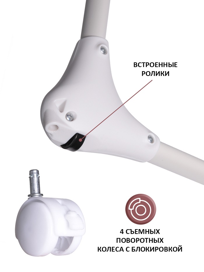 - Колеса со стопорами съемные. В задние ножки встроены ролики. Спереди резинки.
