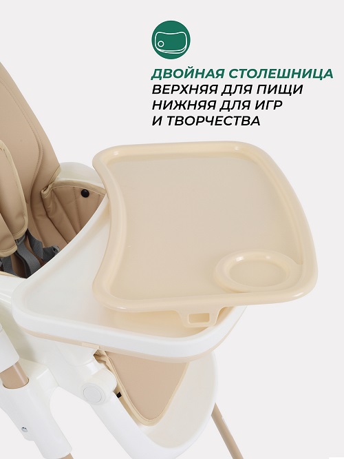 двойная столешница. Для принятия пищи используется верхняя столешница. В ней имеется круглое отделение под поильник. Верхнюю столешницу очень удобно снимать сразу после еды, чтобы помыть или протереть. Нижняя столешница используется для игр, лепки, рисования.