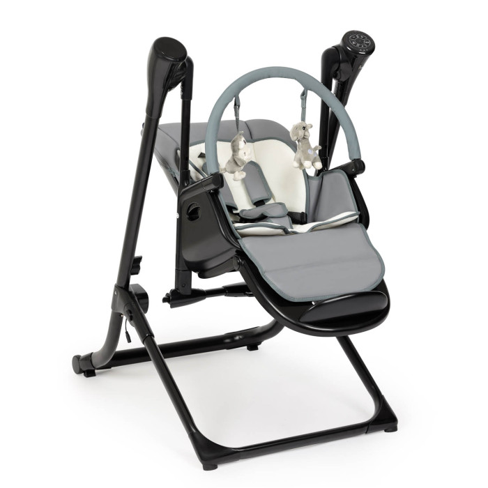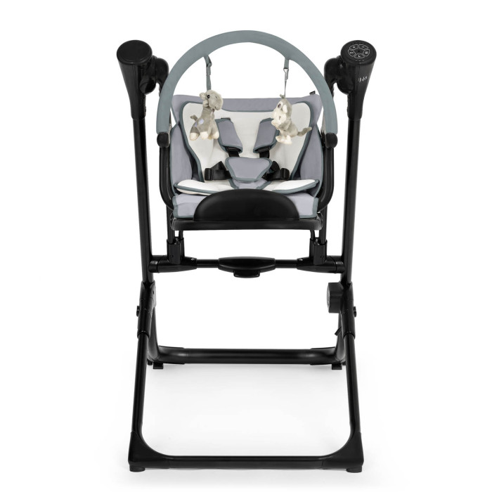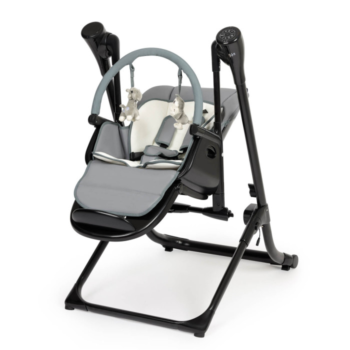 Электронные качели. Это удобный укачивающий центр для ребенка с рождения до 9 кг. Преобразуется со стульчика в режим качелей в одно нажатие! Качели оснащены 5 режимами качания, таймером на 8, 15 и 30 минут, приятными мелодиями. Управляются качели с пульта дистанционного управления или с помощью панели управления расположенной на самом стульчике. Есть USB - разъем, позволяющий подключить внешний накопитель с другими мелодиями. Внутри качелей ребенок надежно зафиксирован 5-ти точечными ремнями безопасности. Дополнительно на качели можно установить развивающую дугу с двумя игрушками.