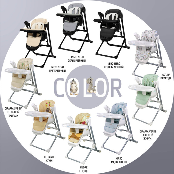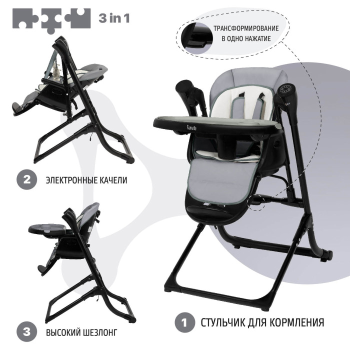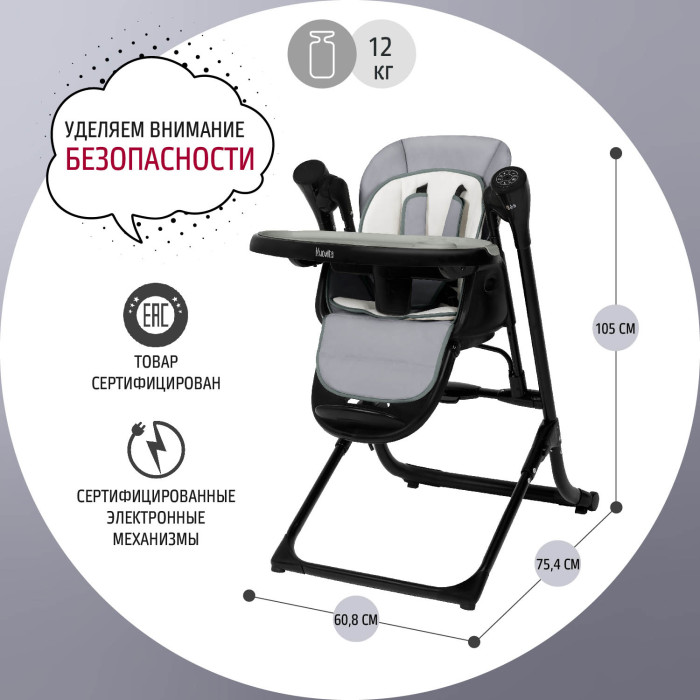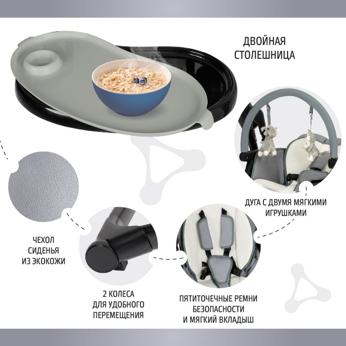 - Особенности стульчиков для кормления: Дуга с игрушками для стульчика, Моющееся сидение, Режим качели
