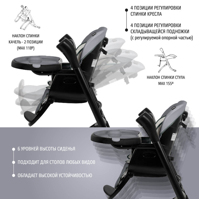 - Регулировка стульчика для кормления: высоты, высоты подножки, наклона спинки, расстояния от спинки до столика