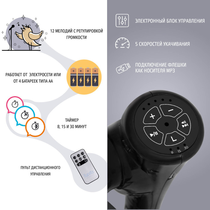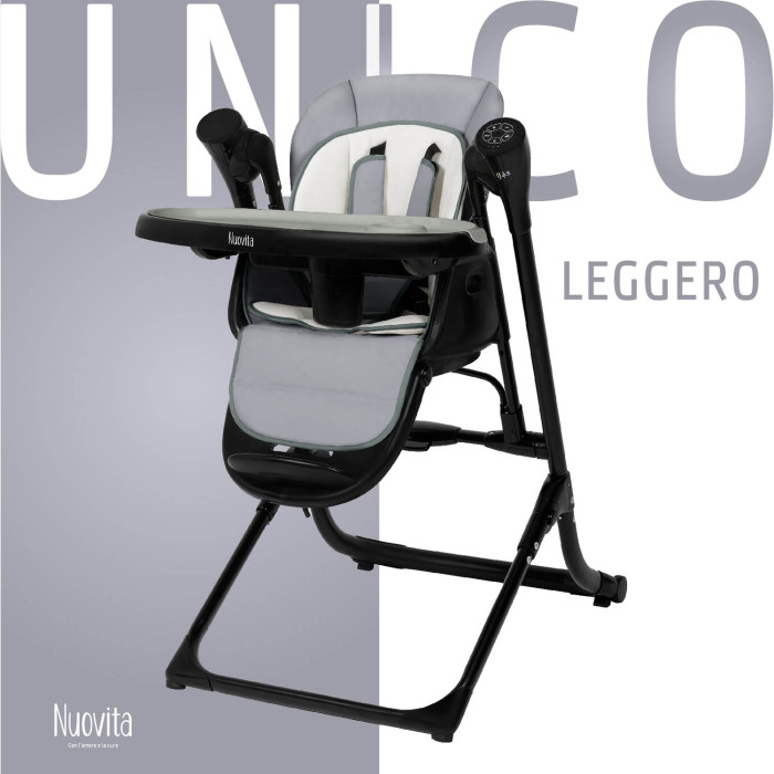 Стул для кормления Nuovita Unico Leggero Nero (нуовита юнико леггеро неро) - уникальный стульчик, объединяющий в себе сразу несколько необходимых для ребенка предметов: стул для кормления, высокий шезлонг, электронные качели. Такой стул поможет не только удобно кормить ребенка, но обеспечить ему комфортное нахождение на кухне, приятное место препровождения с музыкой и игровой дугой, приятное покачивание которое поможет успокоиться и настроится на сон. Это целая уникальная система, которая будет развлекать ребенка, даря вам время на другие дела или отдых.