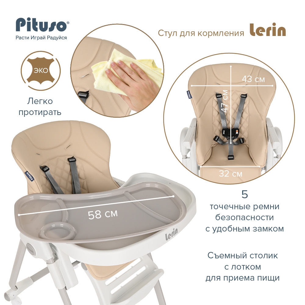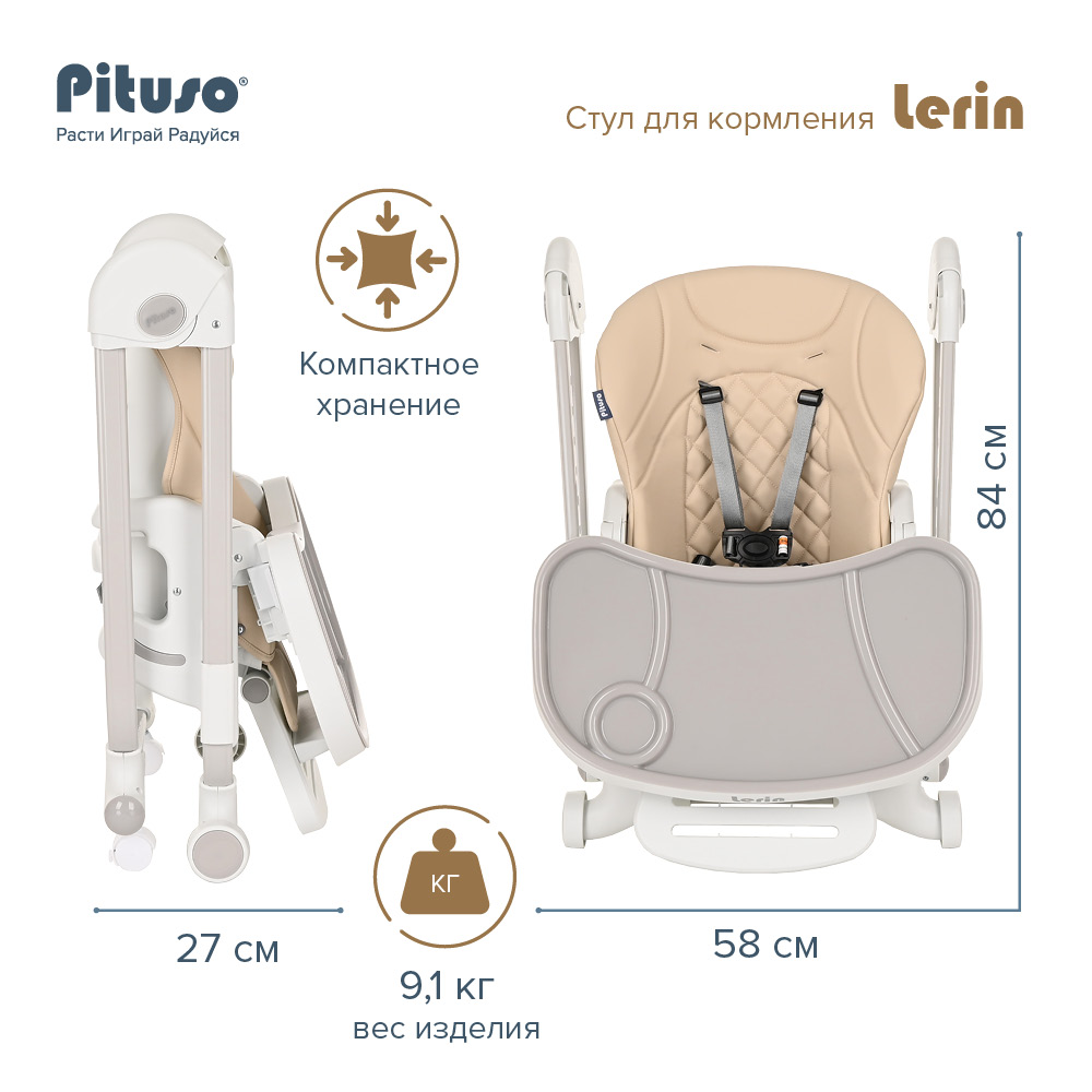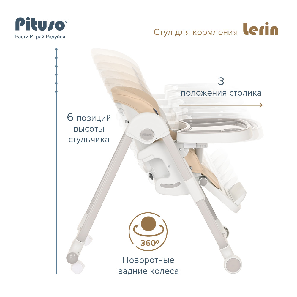 Стул для кормления PITUSO Lerin (питусо лерин) - функциональный и удобный стульчик для кормления. Алюминиевая рама создает устойчивость и надежность, а задние колесики оснащены педалью тормоза. Безопасная конструкция с мягким сидением легко чистится и компактно складывается. Съемный столик подгоняется в наилучшее положение для кормления, а лоток для приема пищи легко моется. Высоту стульчика Pituso LERIN можно настроить в 6 положениях. Пятиточечные страховочные ремни безопасности позволят весело проводить время с малышом, не опасаясь, что он вывалится наружу. Свободно регулируемый угол наклона спинки и 3-х ступенчатая регулировка подножки позволит ребенку сладко вздремнуть после приема пищи. Современная эргономичная форма прекрасно впишется в любой интерьер.