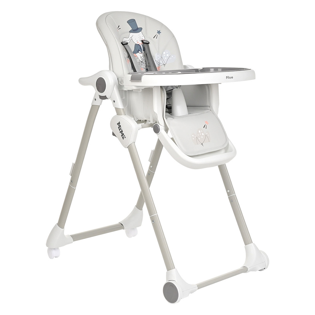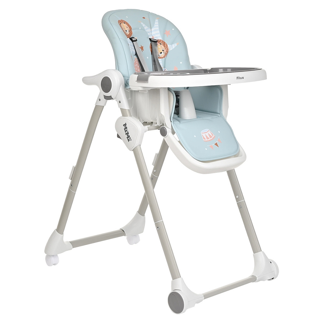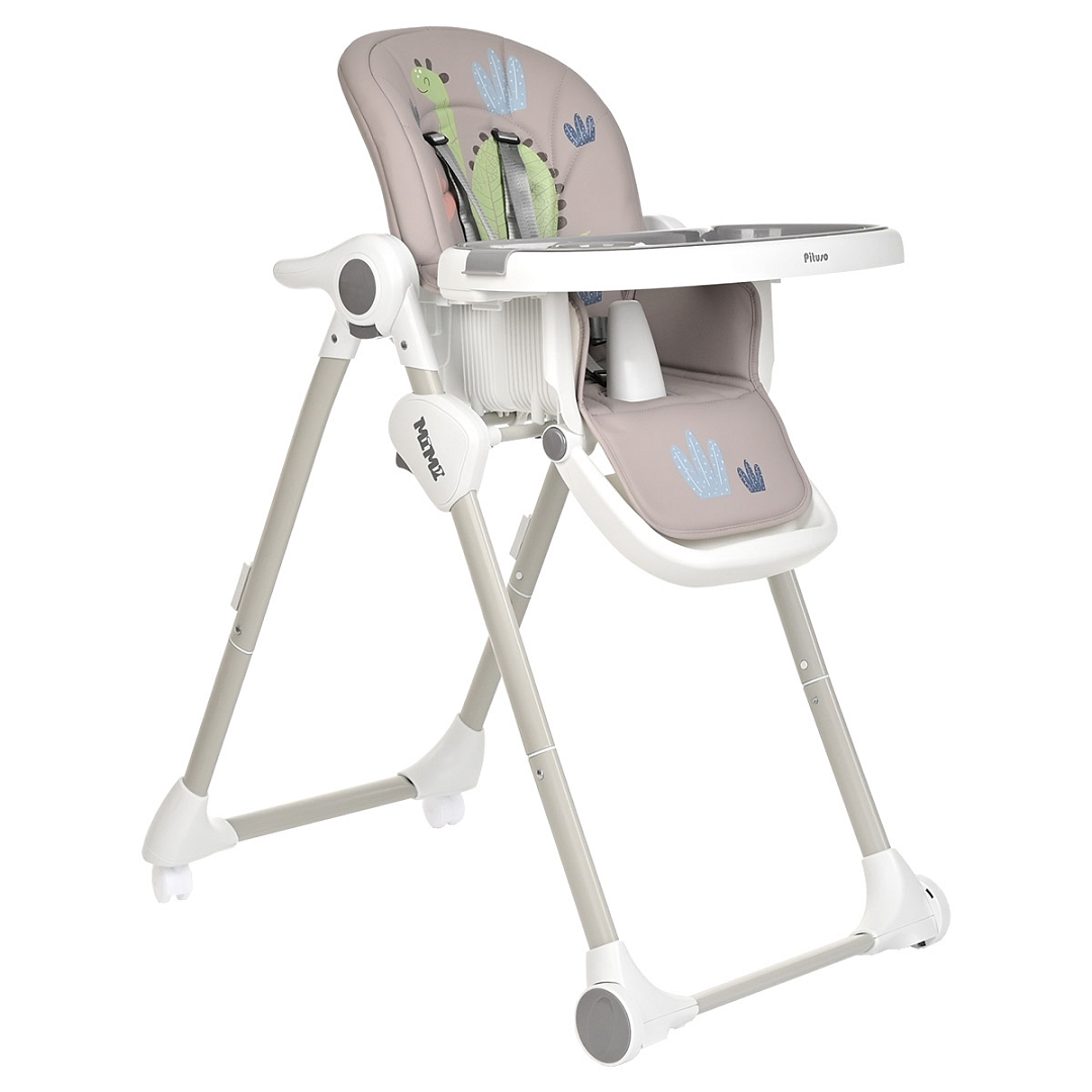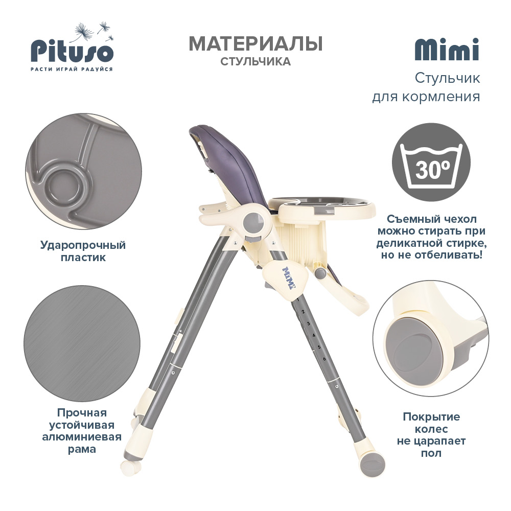 Стул для кормления PITUSO MIMI (Питусо Мими) - устойчивый и комфортный стульчик для кормления. Надежная алюминиевая рама с безопасными для напольных покрытий колесиками. Безопасная конструкция с мягким съемным сидением легко чистится и компактно складывается. 3 позиции для регулировки столика позволят настроить наилучшее положение для кормления, а лоток для приема пищи отлично моется в посудомоечной машине. Пятиточечные страховочные ремни безопасности помогут весело проводить время с малышом, не опасаясь, что он вывалится наружу. Угол наклона спинки фиксируется в 3 положениях, 3-х ступенчатая регулировка подножки позволит ребенку сладко вздремнуть после приема пищи. Современная эргономичная форма прекрасно впишется в любой интерьер.