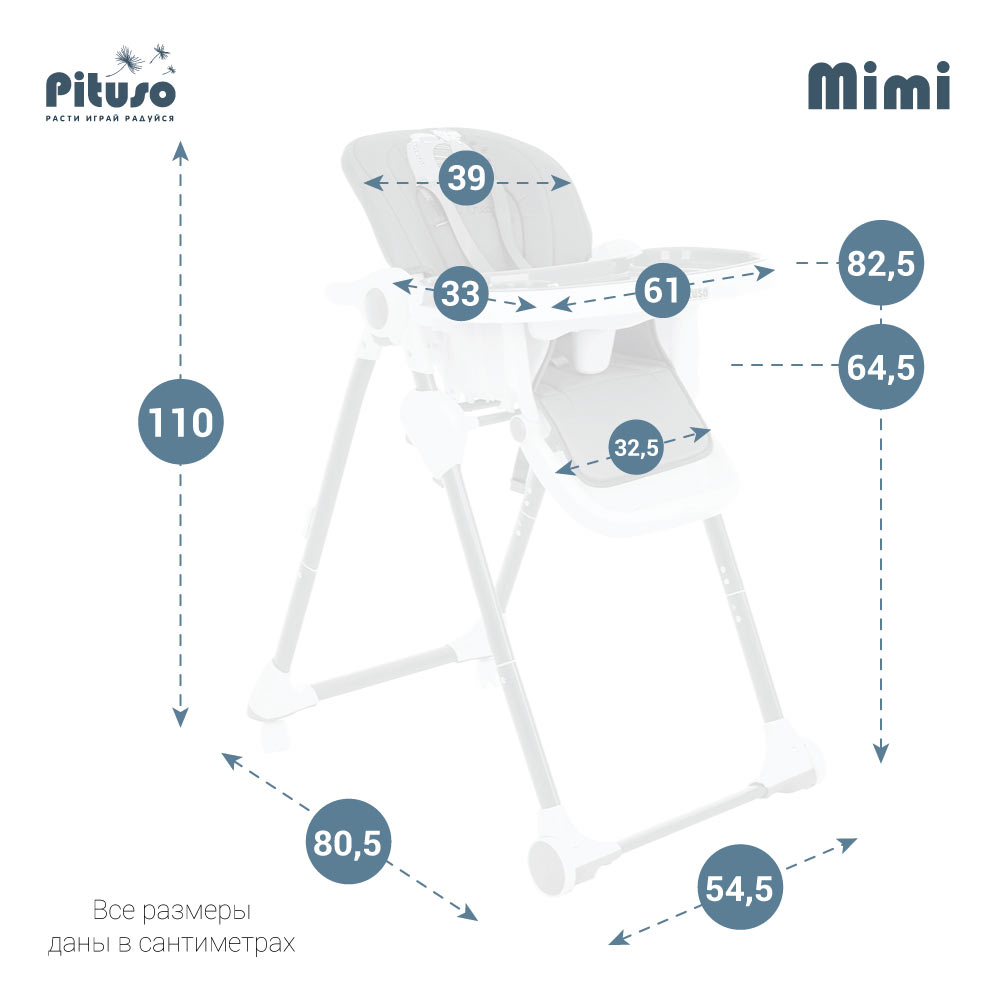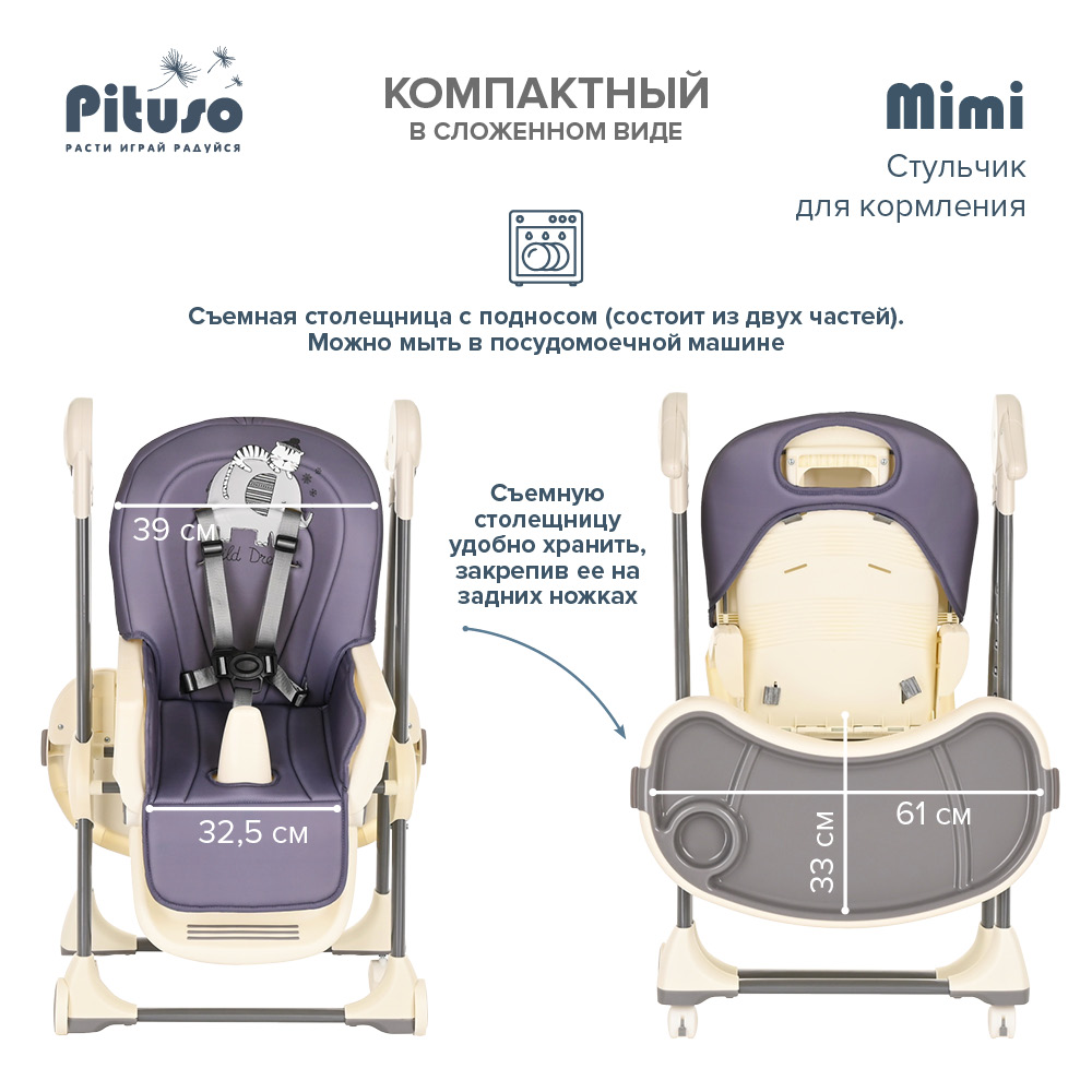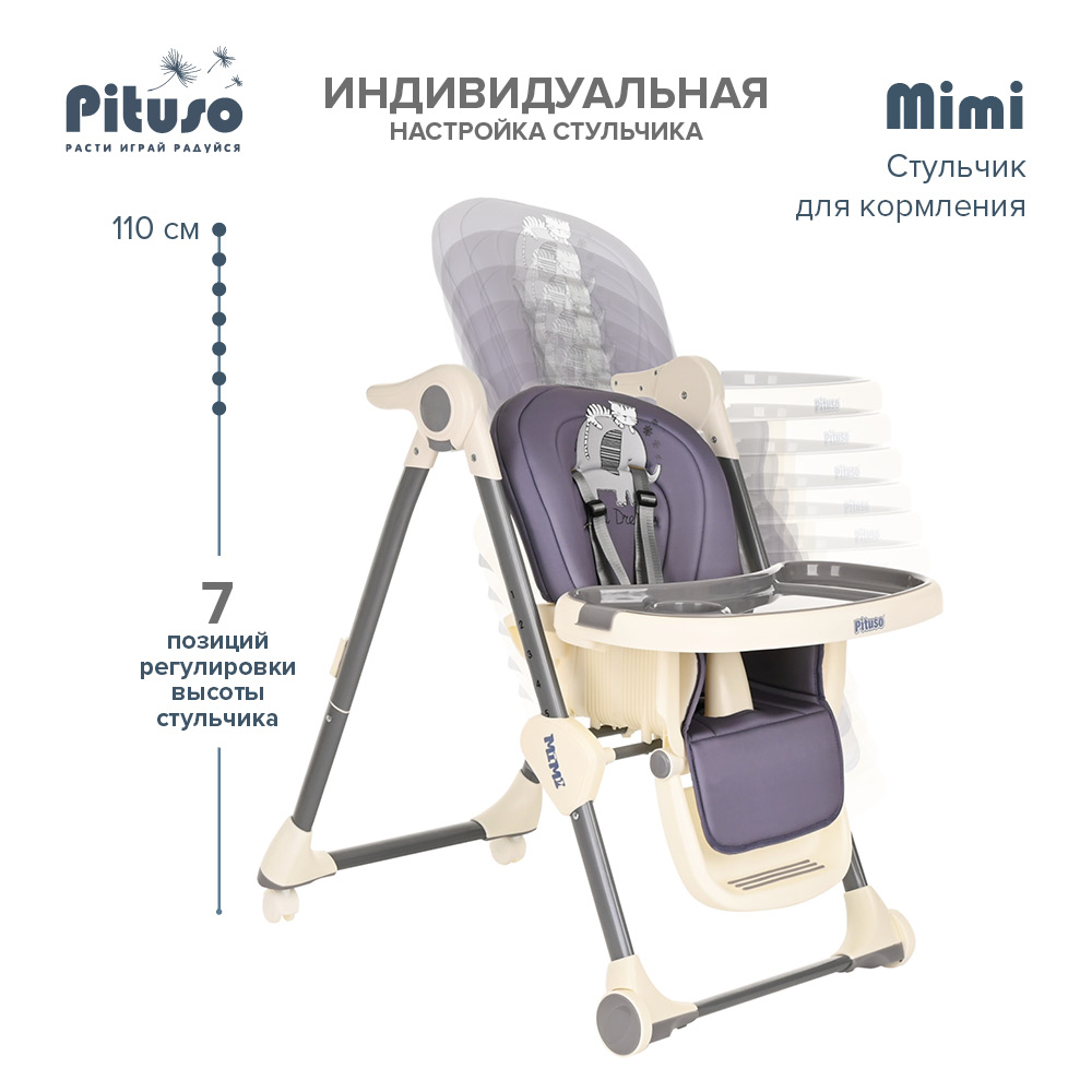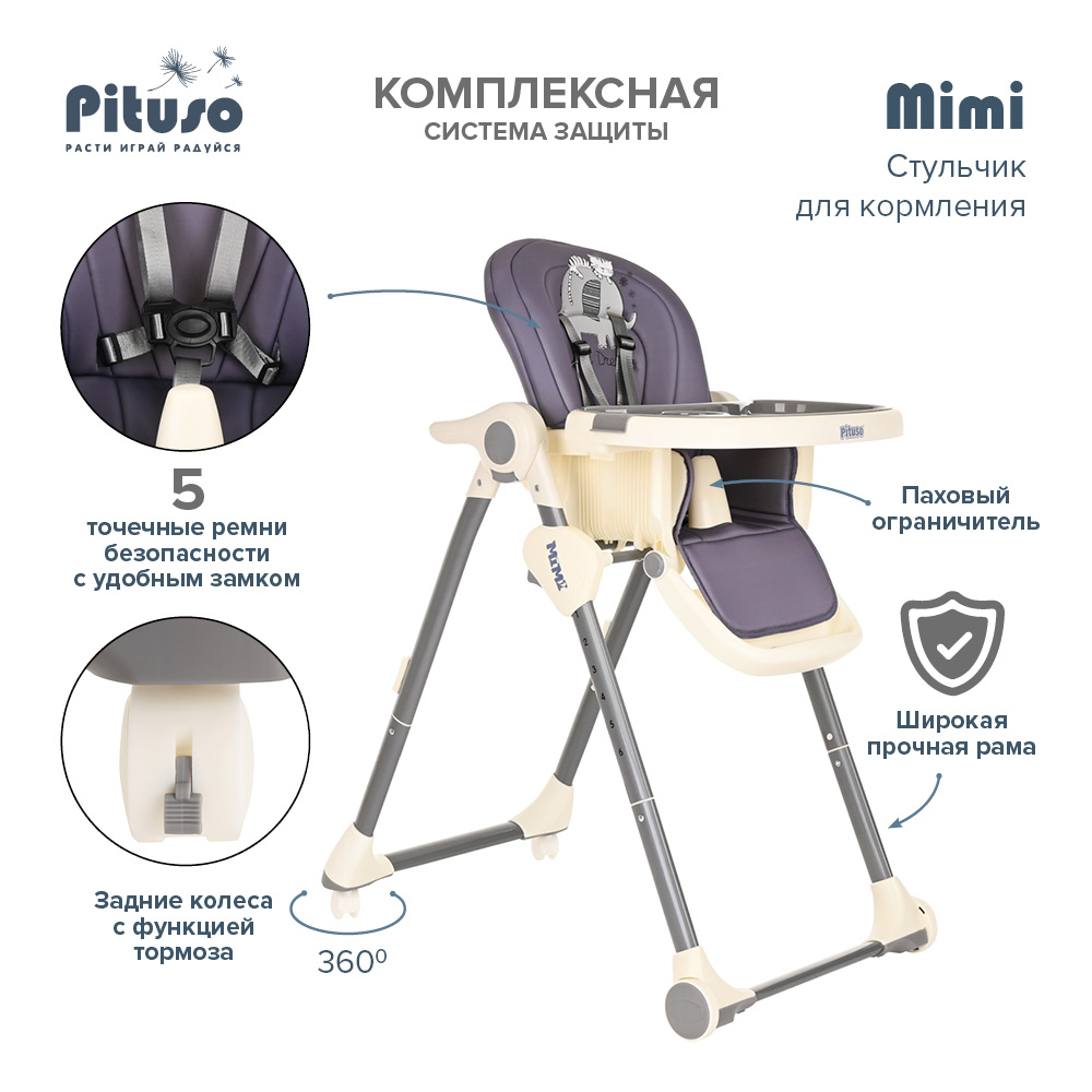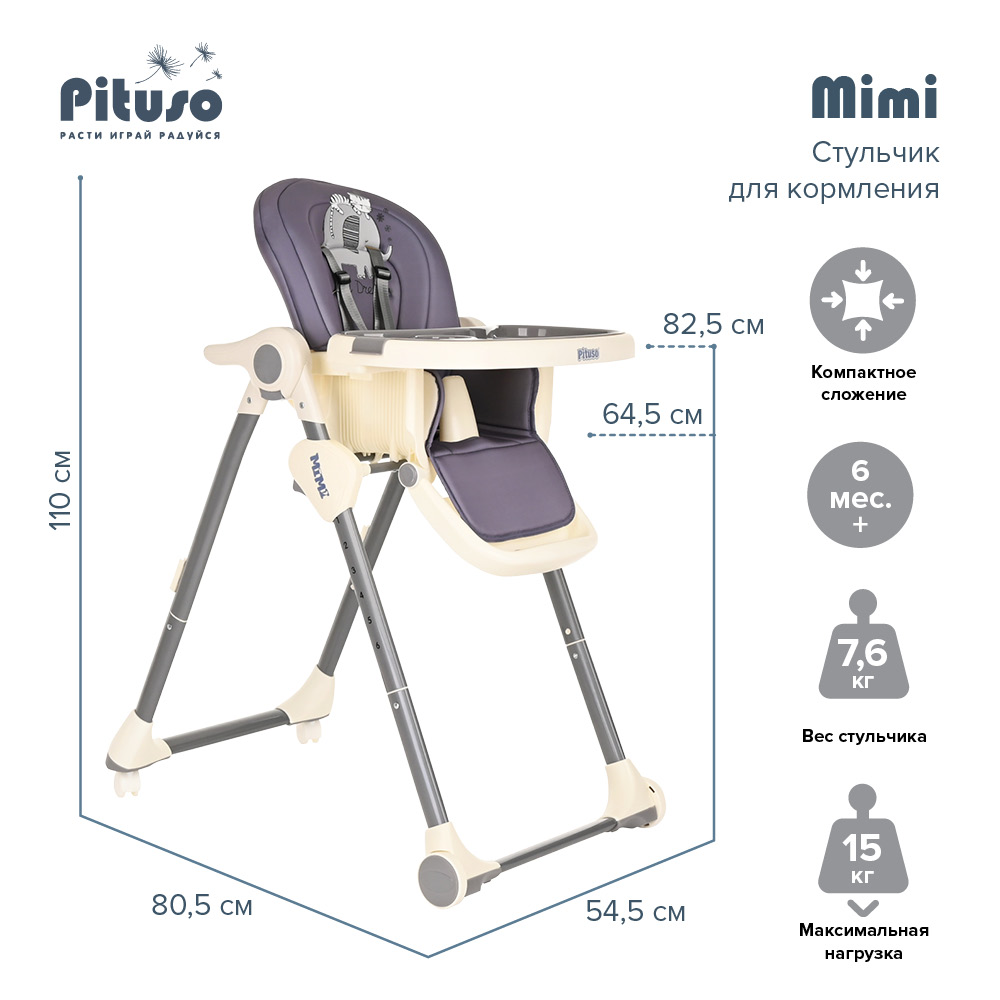 Стул для кормления PITUSO MIMI (Питусо Мими) - устойчивый и комфортный стульчик для кормления. Надежная алюминиевая рама с безопасными для напольных покрытий колесиками. Безопасная конструкция с мягким съемным сидением легко чистится и компактно складывается. 3 позиции для регулировки столика позволят настроить наилучшее положение для кормления, а лоток для приема пищи отлично моется в посудомоечной машине. Пятиточечные страховочные ремни безопасности помогут весело проводить время с малышом, не опасаясь, что он вывалится наружу. Угол наклона спинки фиксируется в 3 положениях, 3-х ступенчатая регулировка подножки позволит ребенку сладко вздремнуть после приема пищи. Современная эргономичная форма прекрасно впишется в любой интерьер.