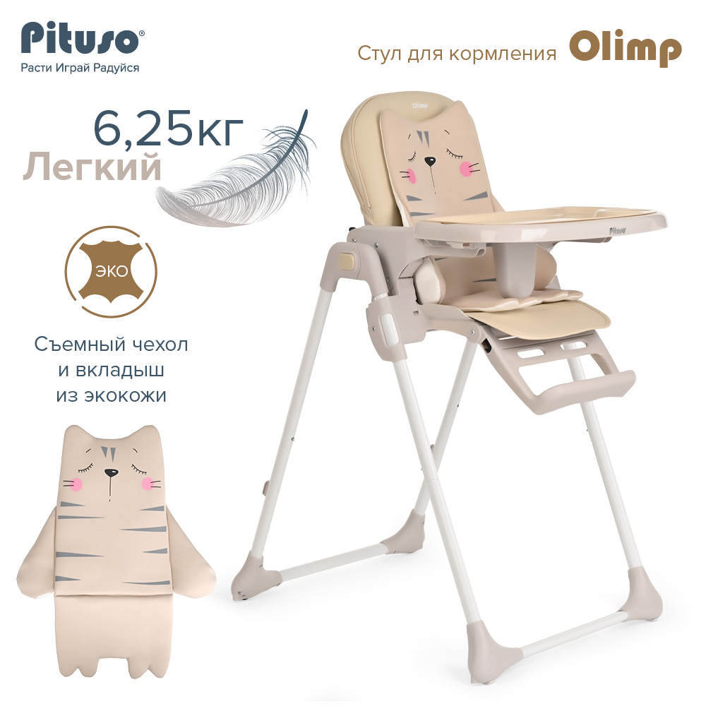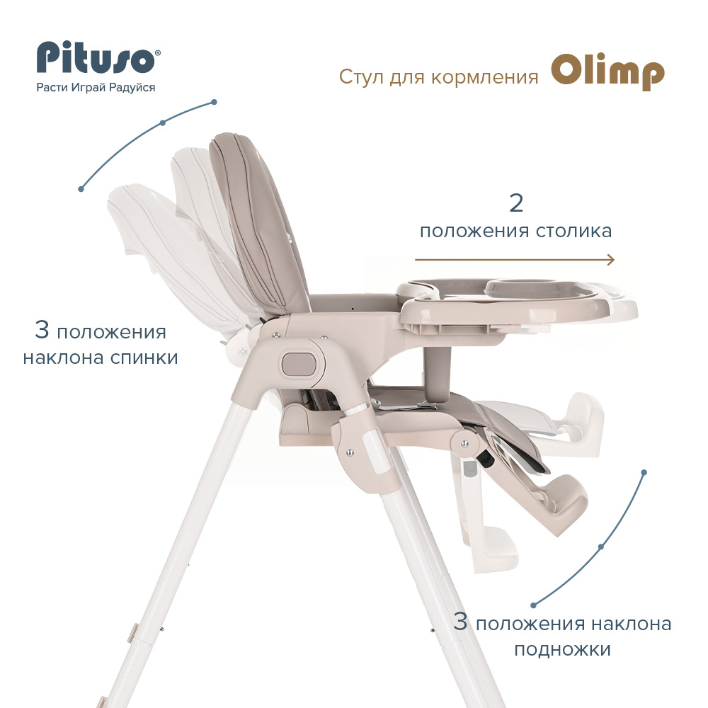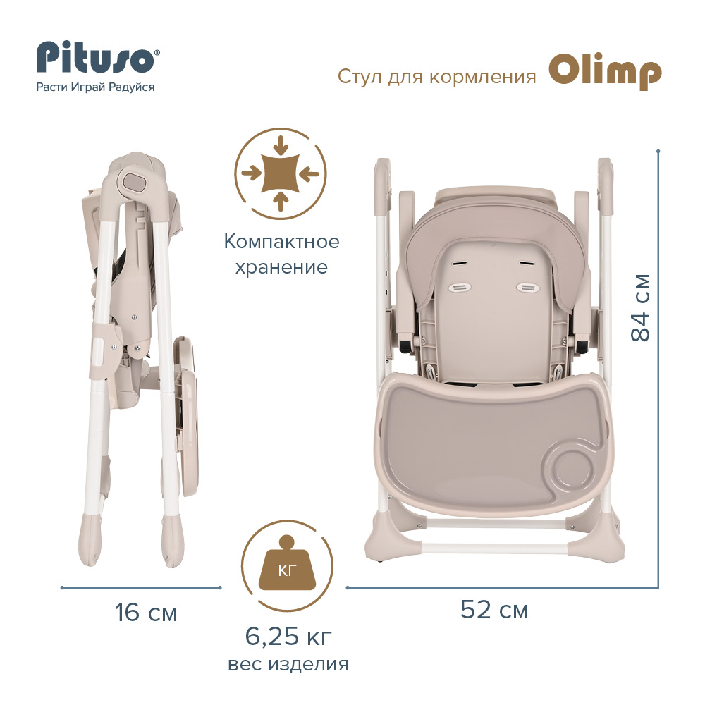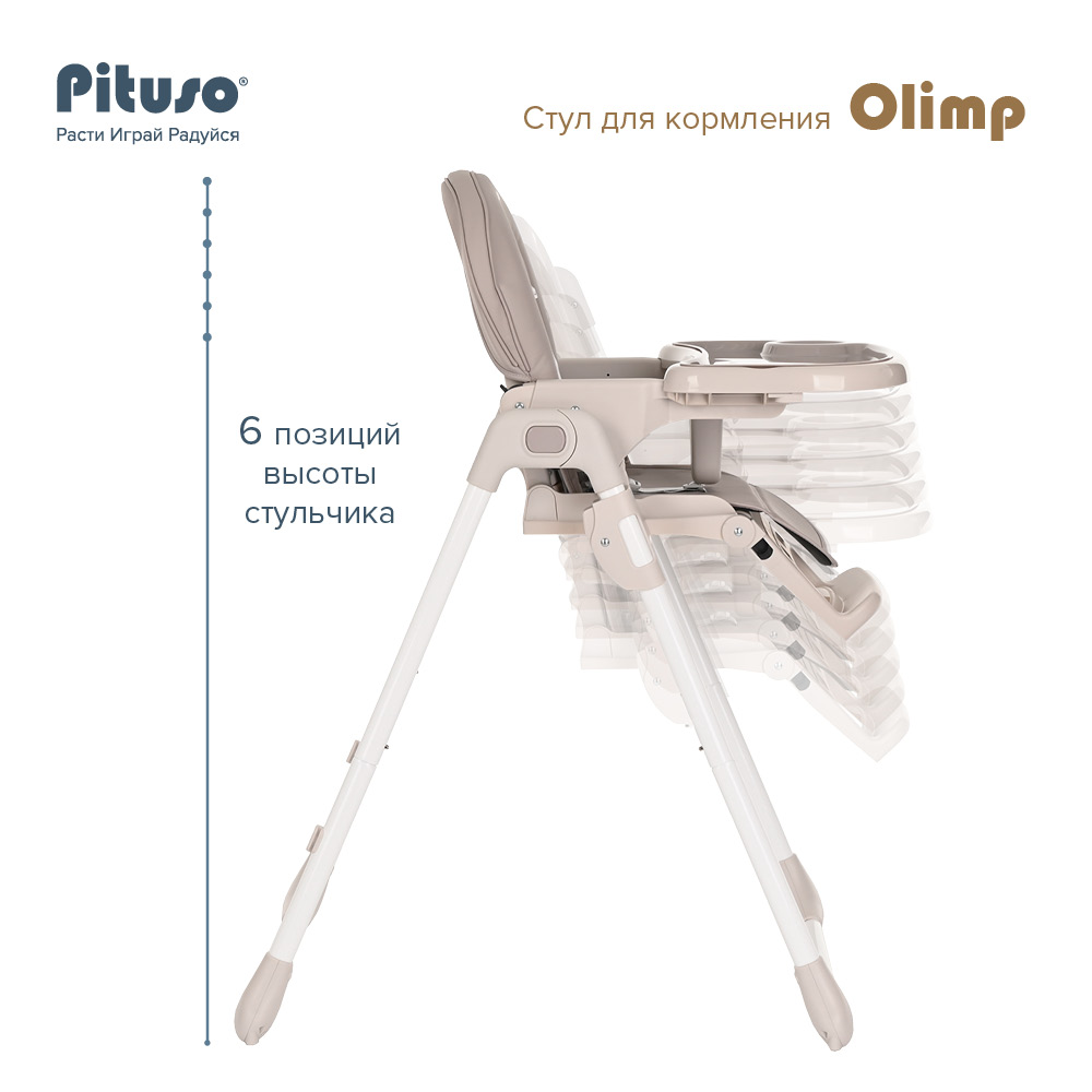 Стул для кормления PITUSO Olimp (Питусо олимп) - функциональный и удобный стульчик для кормления. Алюминиевая рама создает устойчивость и надежность, а задние колесики оснащены педалью тормоза. Безопасная конструкция с мягким сидением легко чистится и компактно складывается. Съемный столик подгоняется в наилучшее положение для кормления, а лоток для приема пищи легко моется. Высоту стульчика Pituso OLIMP можно настроить в 7 положениях. Пятиточечные страховочные ремни безопасности позволят весело проводить время с малышом, не опасаясь, что он вывалится наружу. Свободно регулируемый угол наклона спинки в 3-х положениях и 3-х ступенчатая регулировка подножки позволит ребенку сладко вздремнуть после приема пищи. Современная эргономичная форма прекрасно впишется в любой интерьер. Стульчик оснащен 2 колесиками на задних ножках. Отличительная особенность данной модели удобное и быстрое сложение одной кнопкой, модель очень компактная и удобная в быту, не занимает много места в сложенном виде, а с помощью колесиков легко перемещать по комнате.