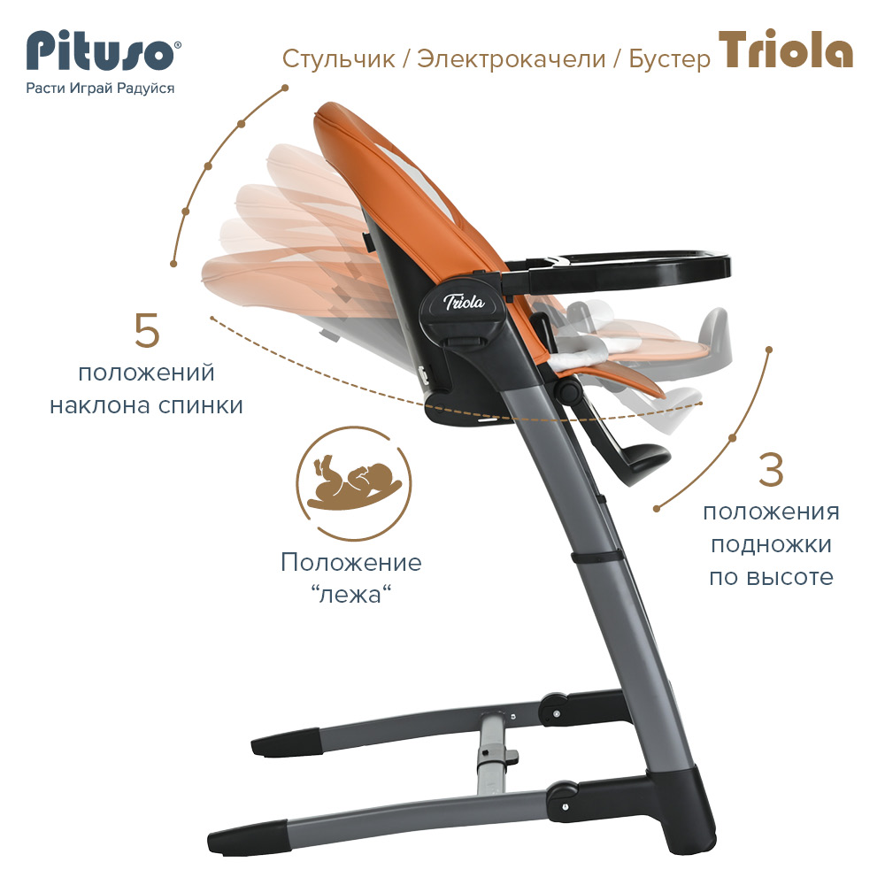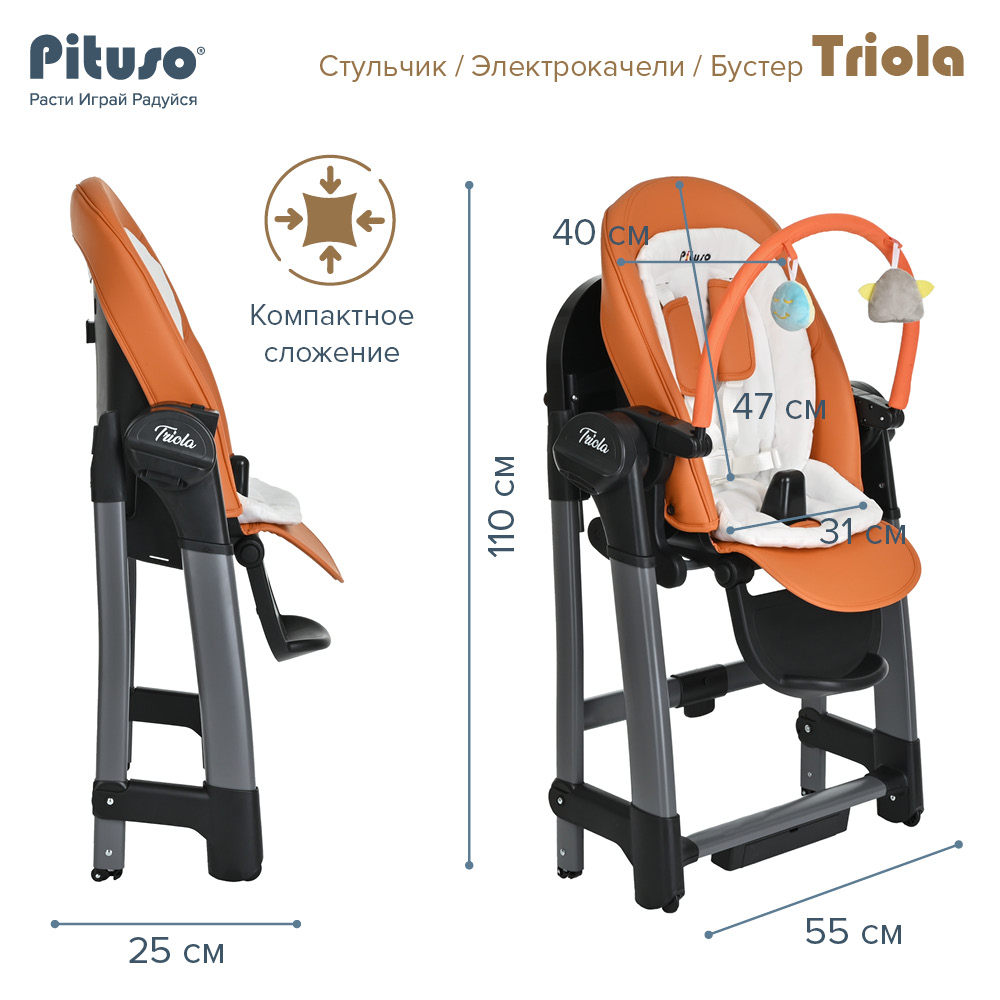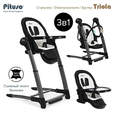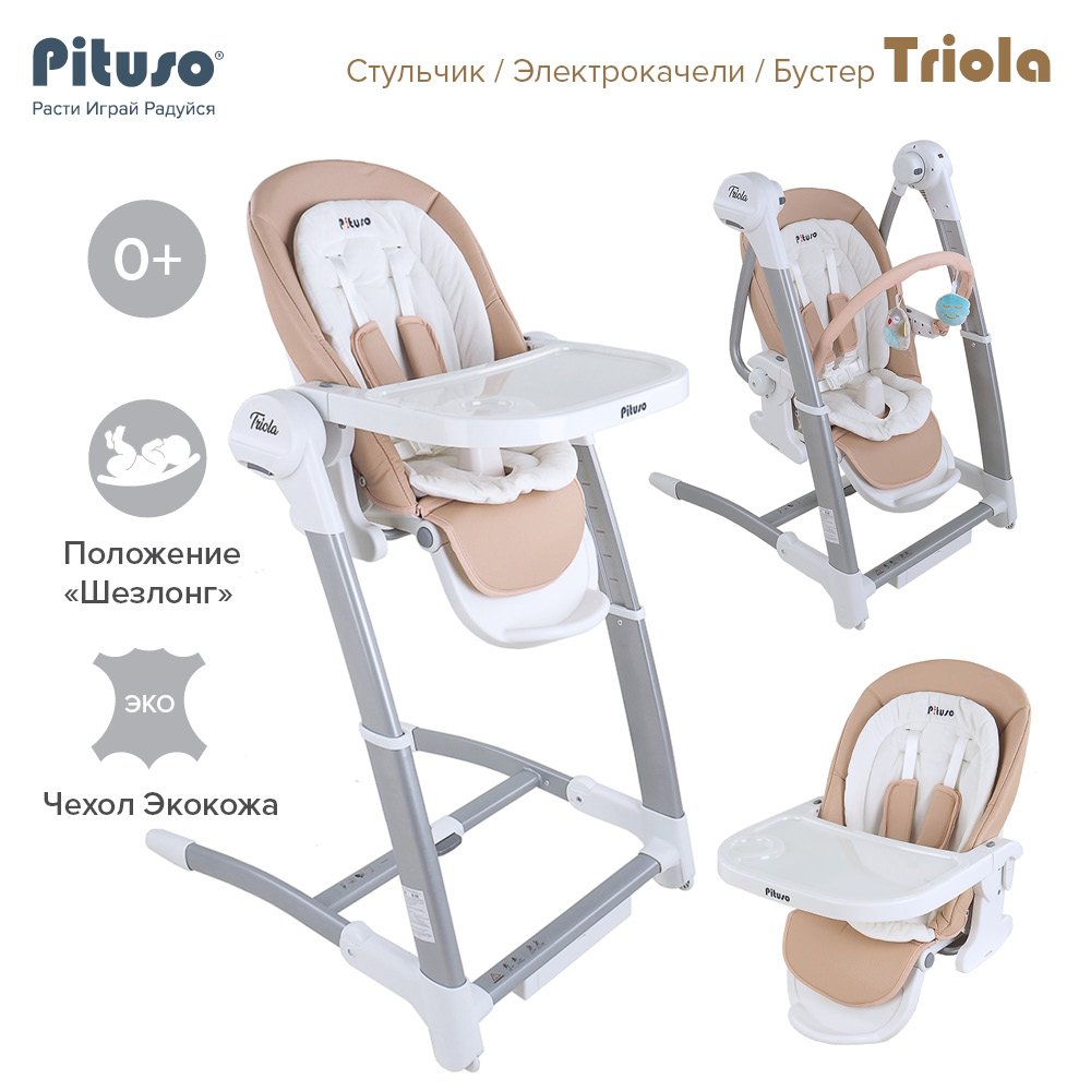 Стул для кормления PITUSO TRIOLA 3 в 1 (Питусо Триола) - уникальное устройство, которое можно использовать с рождения ребенка. Стульчик заменит сразу несколько полезных аксессуаров для мамы: электрокачели, стульчик для кормления, съемный стульчик - бустер. Стульчик поможет маме и папе все время быть рядом с ребенком, но иметь возможность заниматься своими делами. Стульчик очень практичный, маневренный и удобный в транспортировки и хранении. Обивка стульчика выполнена из качественной эко кожи, которую легко вытереть от загрязнения влажной салфеткой или снять для стирки. Дополнительно для новорожденного предусмотрен мягкий вкладыш из более дышащих тканей.