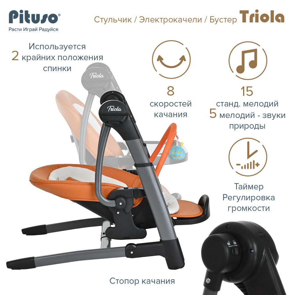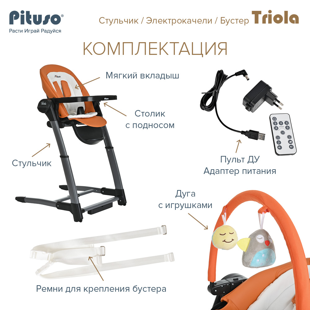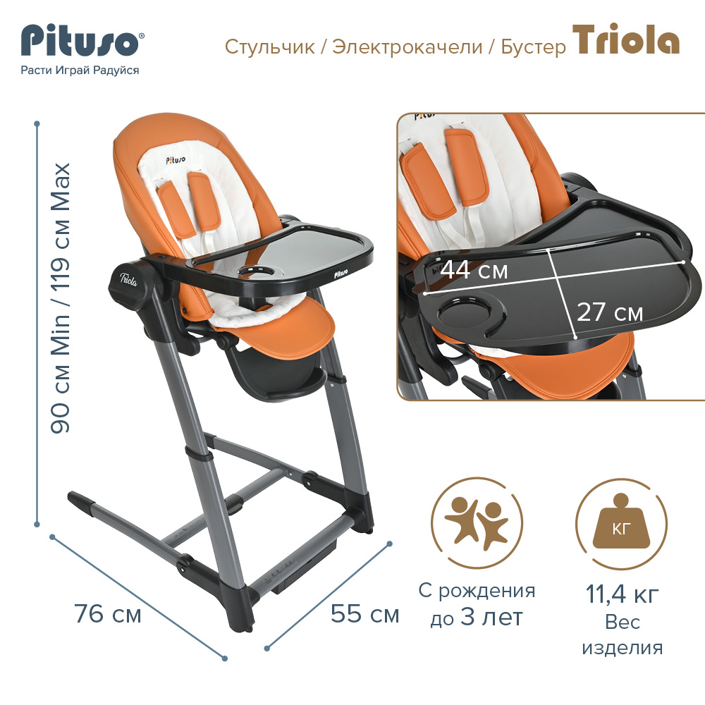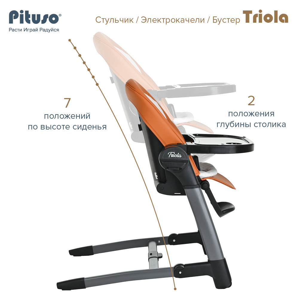 Стул для кормления PITUSO TRIOLA 3 в 1 (Питусо Триола) - уникальное устройство, которое можно использовать с рождения ребенка. Стульчик заменит сразу несколько полезных аксессуаров для мамы: электрокачели, стульчик для кормления, съемный стульчик - бустер. Стульчик поможет маме и папе все время быть рядом с ребенком, но иметь возможность заниматься своими делами. Стульчик очень практичный, маневренный и удобный в транспортировки и хранении. Обивка стульчика выполнена из качественной эко кожи, которую легко вытереть от загрязнения влажной салфеткой или снять для стирки. Дополнительно для новорожденного предусмотрен мягкий вкладыш из более дышащих тканей.