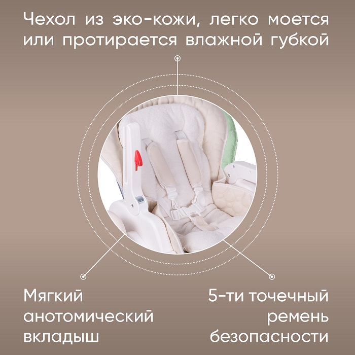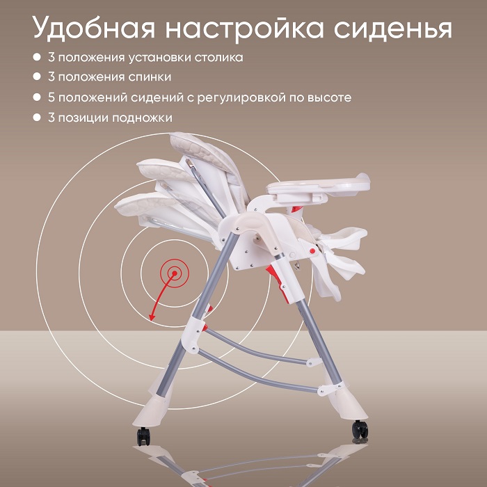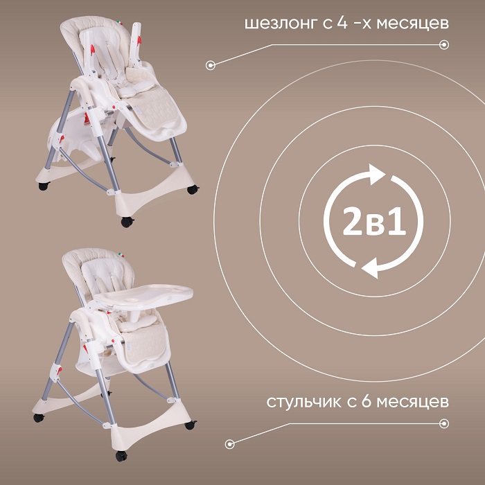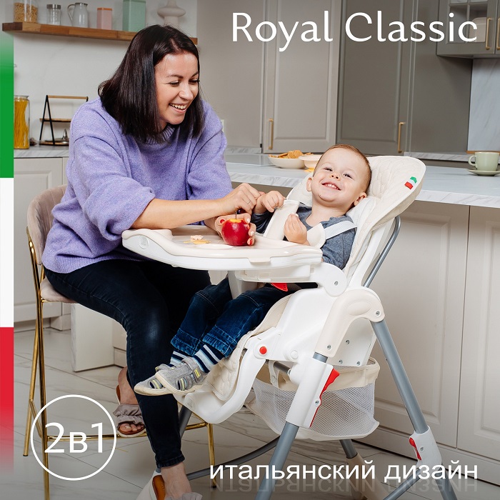 Стул для кормления Sweet Baby Royal Classic (Свит беби роял классик) - классический стульчик - шезлонг для ребенка от 4 месяцев до 3-4 лет. Конструкция стульчика надежная и очень устойчивая. Комфортное сидение для ребенка имеет регулируемую спинку, регулируемую подножку и 5 положений сидения по высоте. Благодаря большому наклону спинки (160 градусов) стульчик отлично подойдет для ребенка, который еще не умеет сидеть, в таком случае стульчик удобно использовать как шезлонг, для комфортного отдыха на кухне. Обивка стульчика выполнена из эко кожи, что обеспечит простоту уборки стульчика после кормления. Обивка легко протирается влажными салфетками или снимается для стирки. Для комфорта малышей предусмотрен дополнительный тканевый эргономический матрасик. В стульчике предусмотрен 5-ти точечный ремень безопасности с регулируемыми ремешками. Для удобного кормления ребенка предусмотрен столик со съемным подносом. Он регулируется по глубине позволяя сделать кормление более удобным.