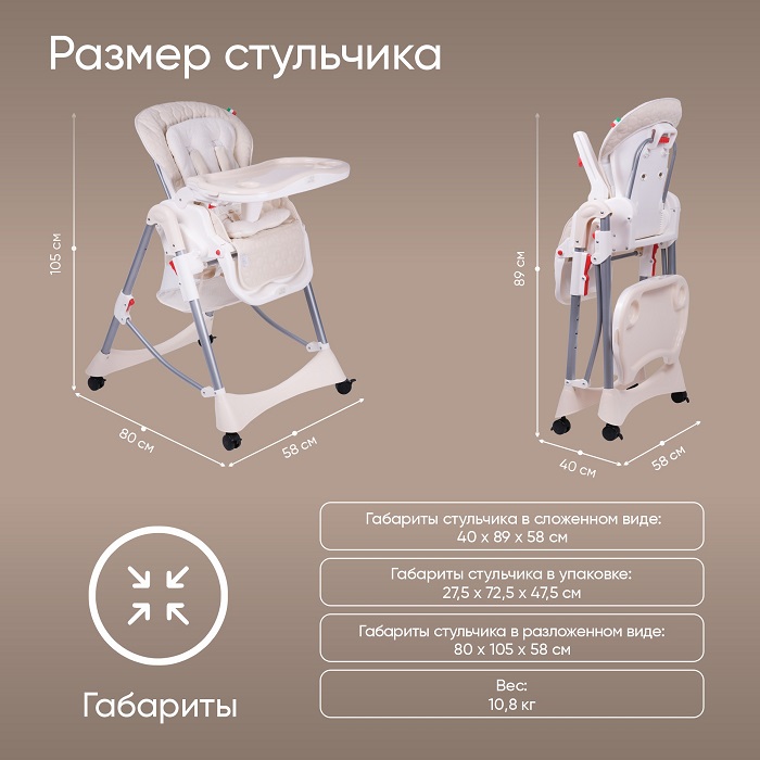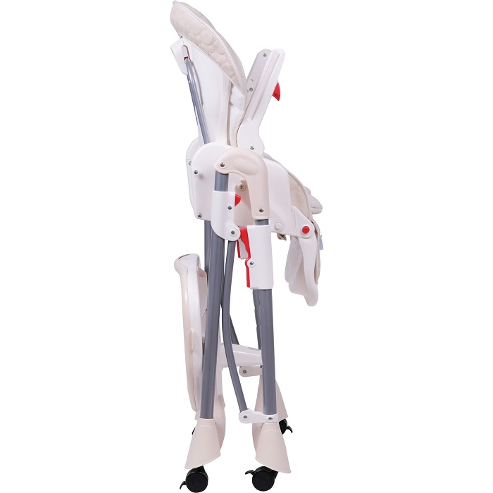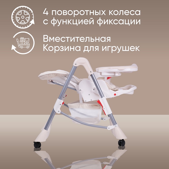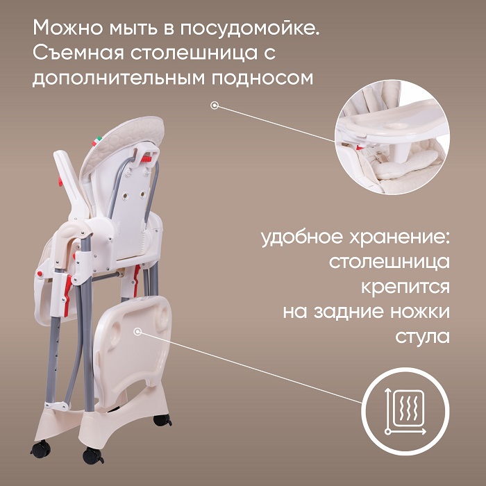 Стульчик оснащен 4 мобильными колесами со стопорами. Он легко передвигается по кухне, а при необходимости надежно фиксируется. Складывается стульчик легко и просто. В сложенном виде не занимает много места. Для более компактного хранения столик фиксируется на раме стульчика.