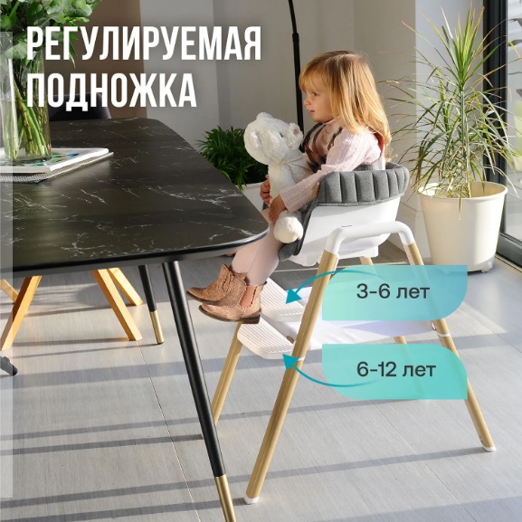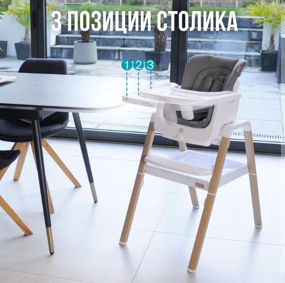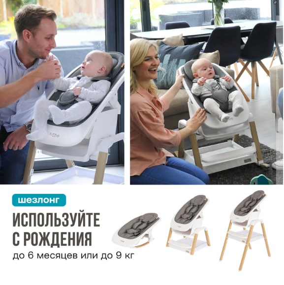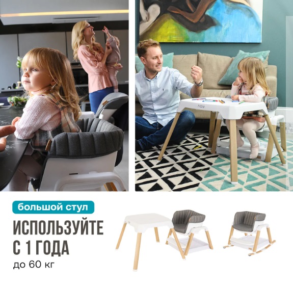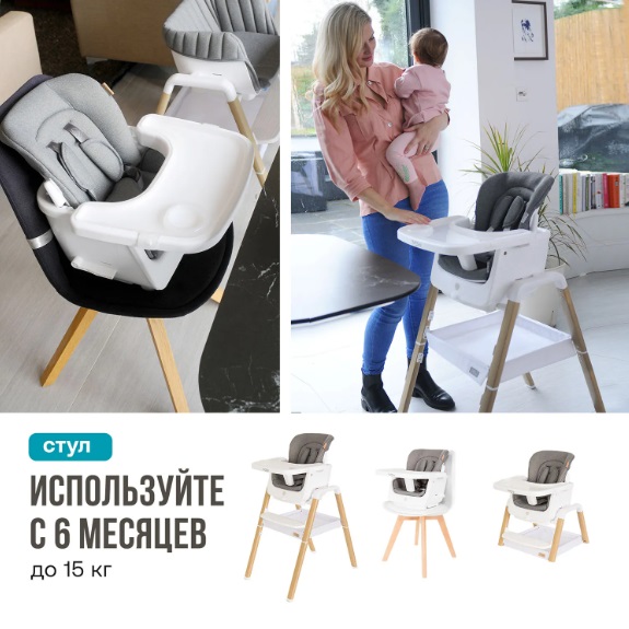 7 режимов использования, включая: стульчик для кормления, низкий стульчик, сиденье-бустер, кресло-качалка для малышей, стульчик для малышей, игровой стол и стульчик, детский стульчик