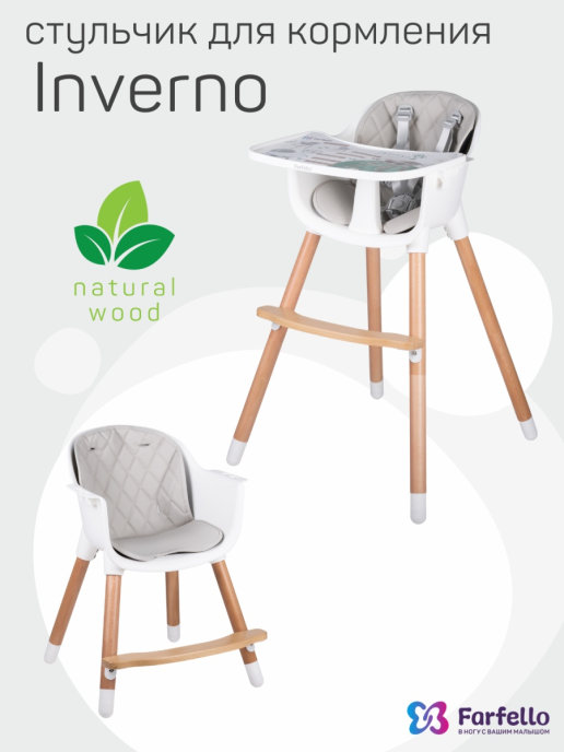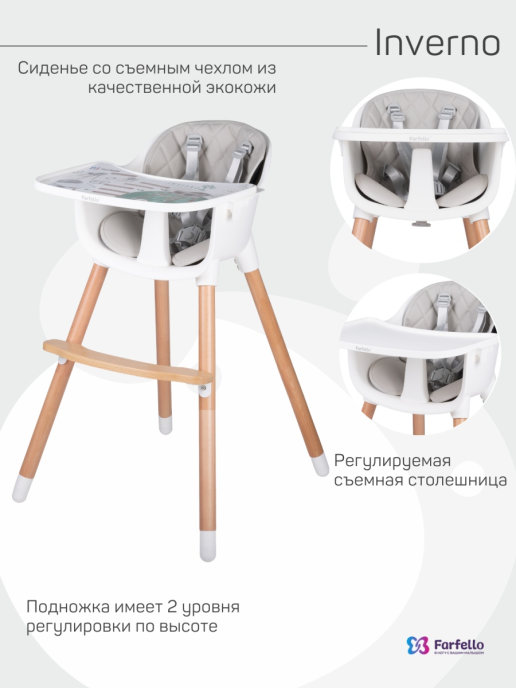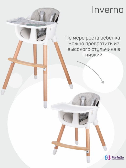 Farfello Inverno (Фарфелло Инверно) - детский стул для кормления, который растет вместе с ребенком. Уникальность стула заключается в его большом функционале: от удобного стула для кормления ребенка до комфортного кресла для игр, занятий. Высота стульчика регулируется за счет деревянных ножек разной длины. Ножки стульчика выполнены из ясеня, что гарантирует надежность и устойчивость модели.