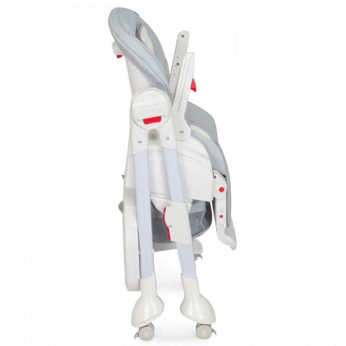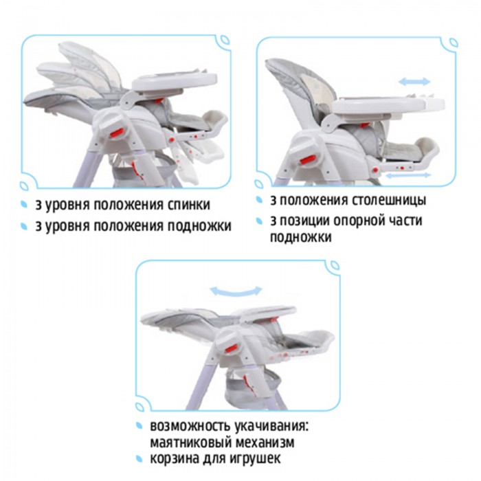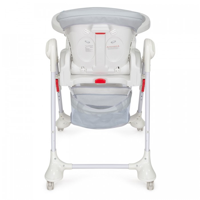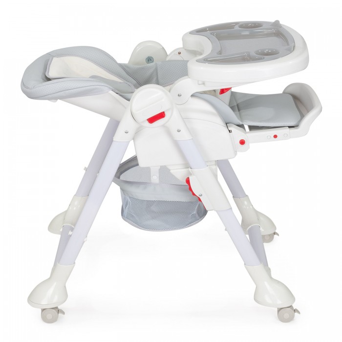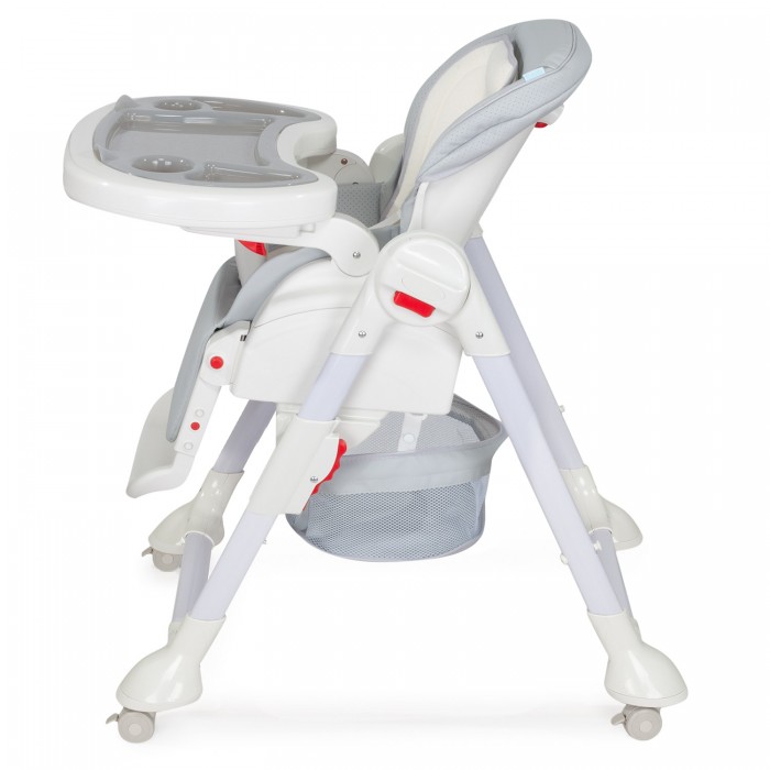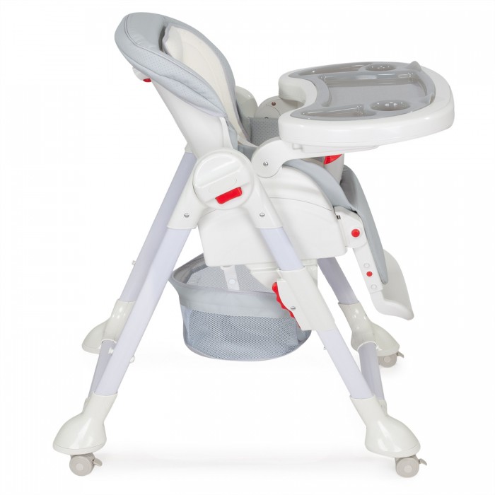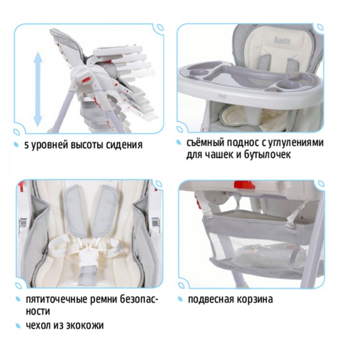 Сидение выполнено из качественной экокожи, которая прочна и проста в уходе. Отдельного внимания заслуживает стильный европейский дизайн с мягкими цветовыми сочетаниями. Дополнительными преимуществами для владельцев станут такие приятные «мелочи», как съёмный поднос с углублениями для чашек и бутылочек; корзинка для игрушек; поворотные колеса с надежной фиксацией и возможность хранения в сложенном виде без посторонней опоры.