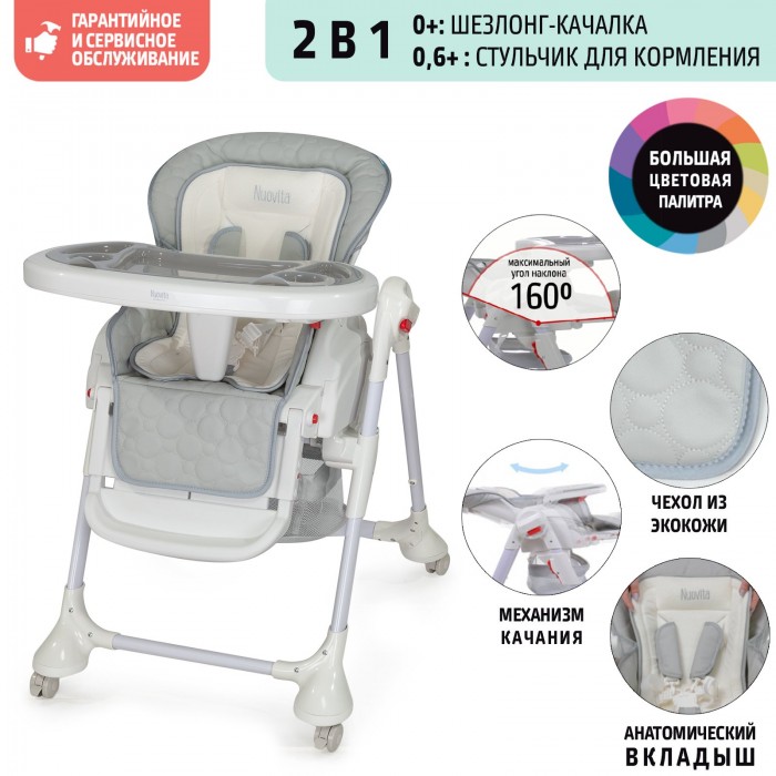 Стул-шезлонг Nuovita Tutela trapuntata (нуовита тутела) - универсальный стульчик который объединяет в своей конструкции двойной функционал: шезлонг-качалка для новорожденного, и стульчик, в котором удобно кормить подросшего малыша. Его можно использовать с рождения до 3- 4 лет. Главным его отличием от других стульчиков является функция качания ( без электропривода), что позволит успокоить новорожденного ребенка без маминых рук. Ребенок будет находиться рядом с вами, а вы сможете заниматься своими делами, наблюдая за малышом.