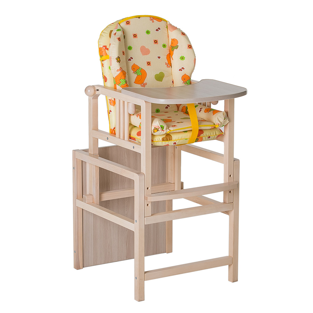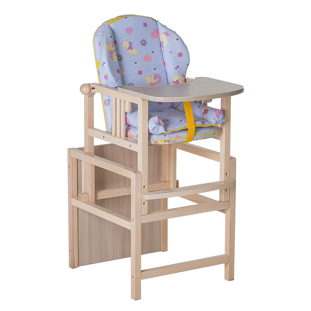 Регулируется также и подножка в трех позициях. Стульчик для кормления оснащен съемной ламинированной столешницей и тканевым разделителем, служащим фиксатором ребенка. Его корпус изготовлен из массива березы, является надёжным и устойчивым. Сидение выполнено из непромокаемого материала, что значительно облегчает уход за ним.