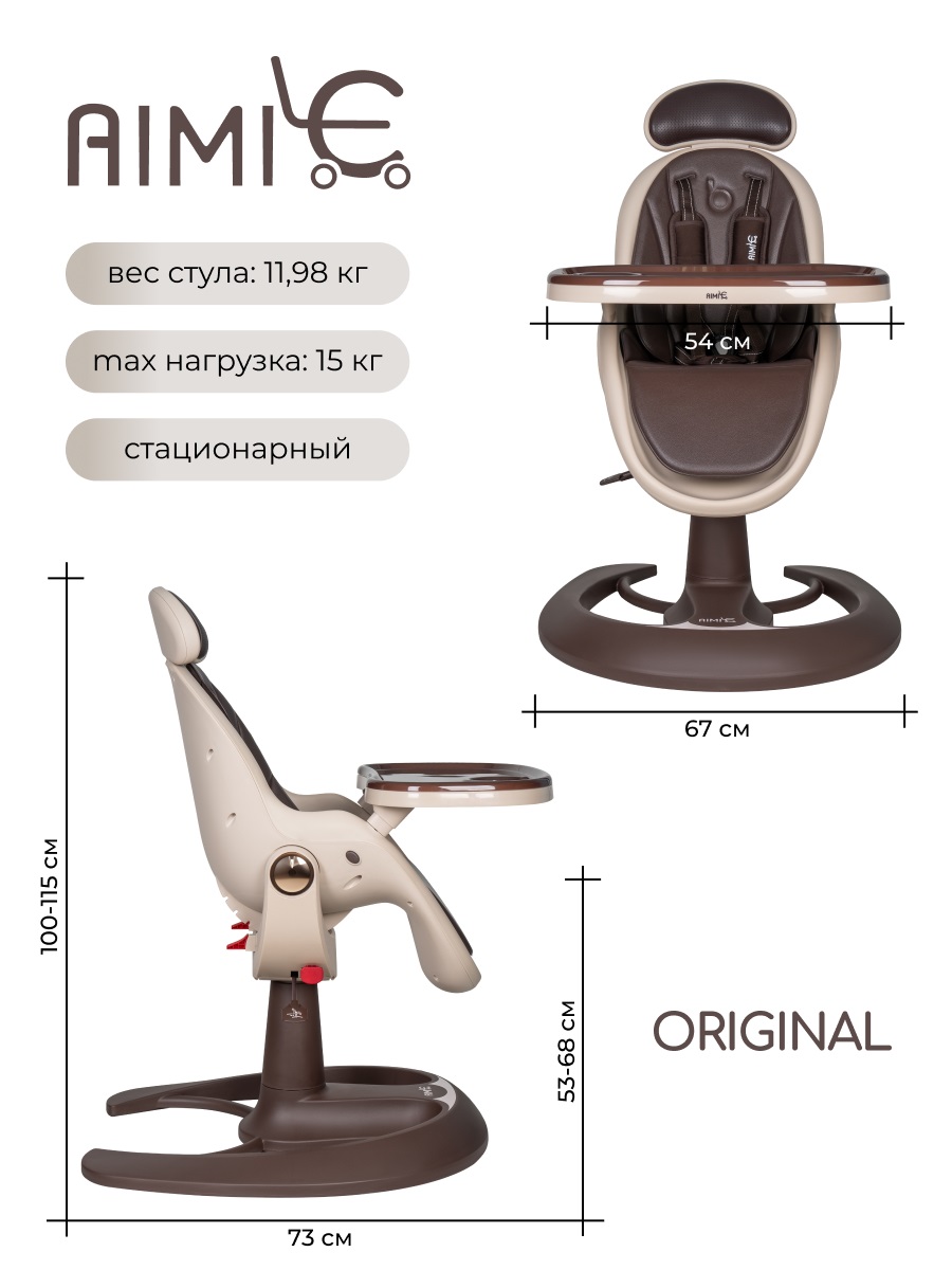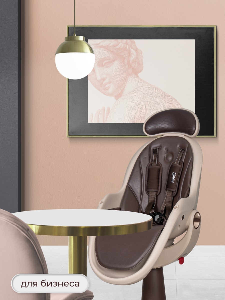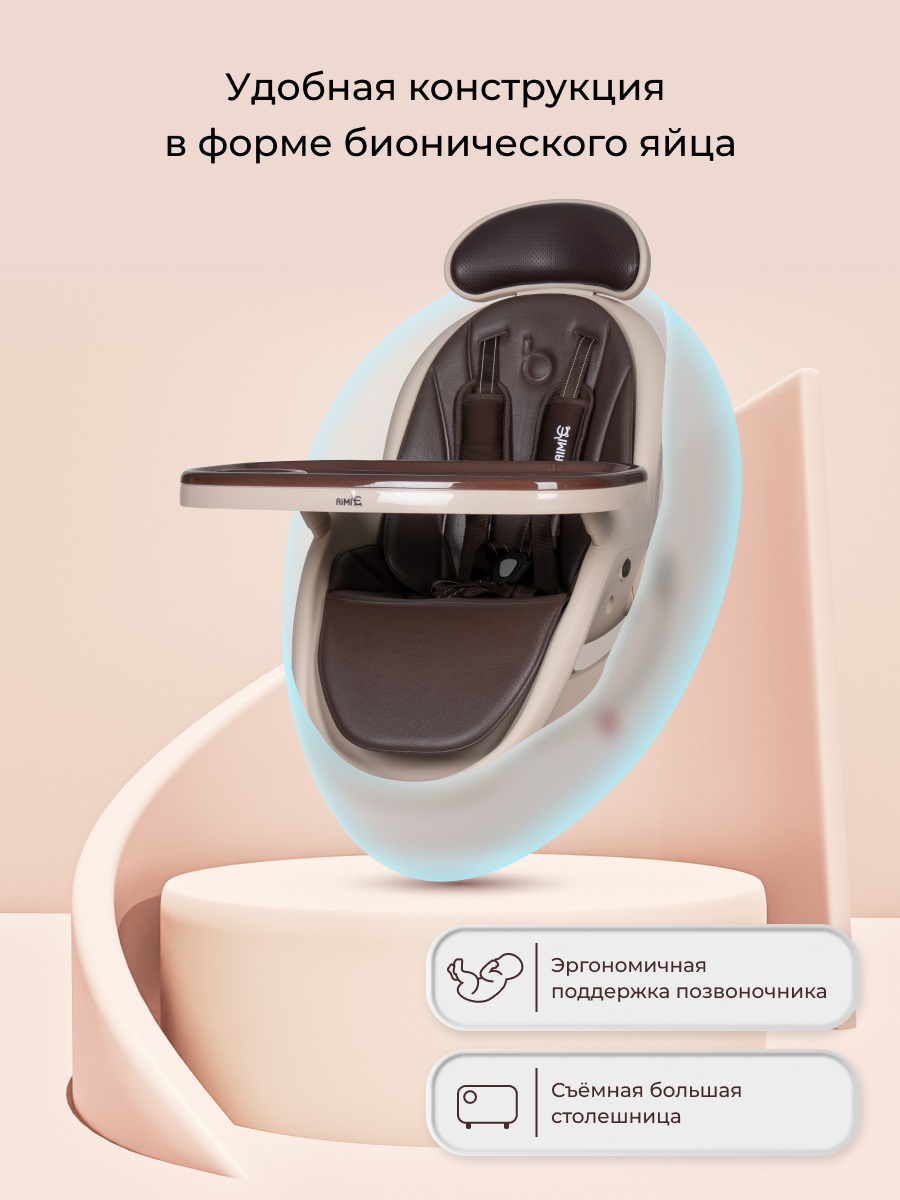 У стульчика Aimile Gold необычный дизайн. Стульчик легко впишется в любой интерьер. Отлично подойдет для дома, дачи, офиса или кафе. Эргономическое сидение выполнено в форме бионического яйца, обеспечивая ребенку комфорт и поддержку позвоночника. 4 наклона спинки позволят ребенку не только комфортно кушать, но и спать или отдыхать после кормления. Двухсторонняя обивка ткань/кожа позволит вам выбрать материал обивки в зависимости от времени года, температуры или просто по настроению. Сидение стульчика регулируется по высоте с помощью газлифта в любом удобном положении. Для дополнительного комфорта и удобства пользователей подголовник снимается.