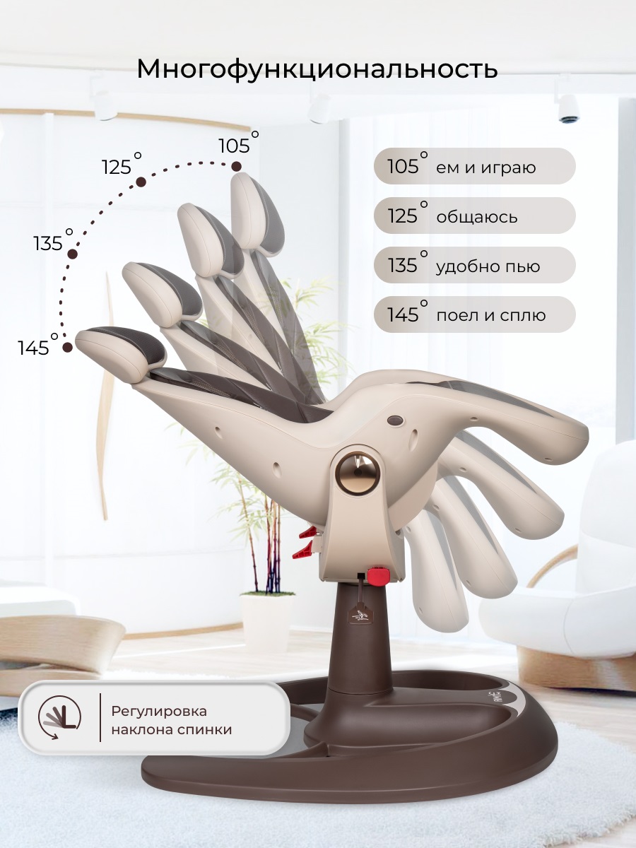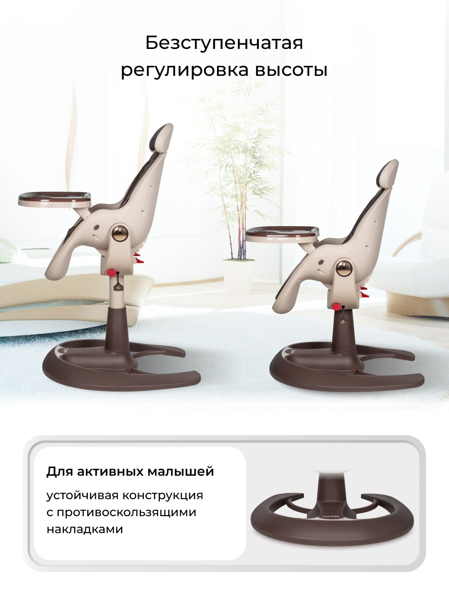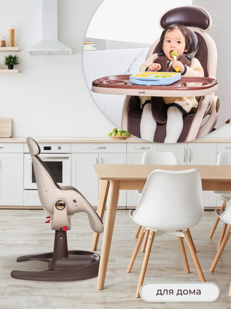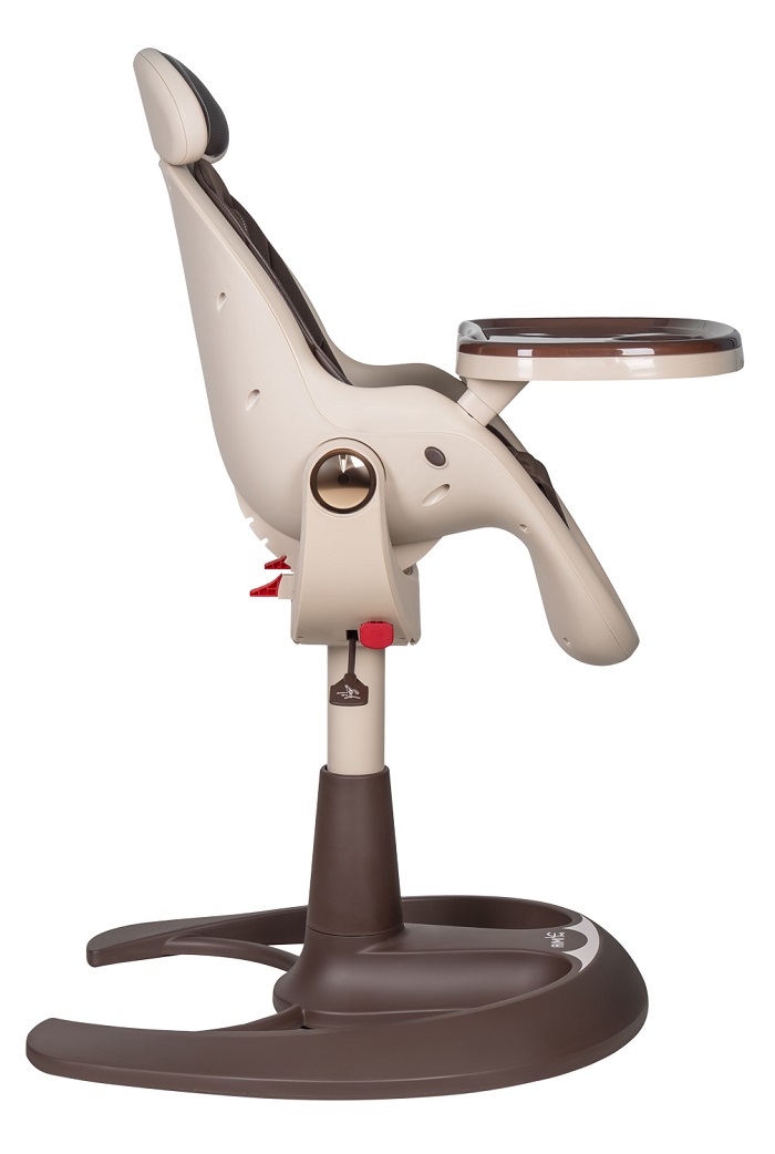 У стульчика Aimile Gold необычный дизайн. Стульчик легко впишется в любой интерьер. Отлично подойдет для дома, дачи, офиса или кафе. Эргономическое сидение выполнено в форме бионического яйца, обеспечивая ребенку комфорт и поддержку позвоночника. 4 наклона спинки позволят ребенку не только комфортно кушать, но и спать или отдыхать после кормления. Двухсторонняя обивка ткань/кожа позволит вам выбрать материал обивки в зависимости от времени года, температуры или просто по настроению. Сидение стульчика регулируется по высоте с помощью газлифта в любом удобном положении. Для дополнительного комфорта и удобства пользователей подголовник снимается.