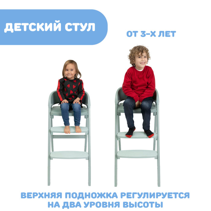 Все варианты регулировки стульчика просты и интуитивно понятны. В комплект входит стульчик с детским сидением, съемный столик для кормления, дополнительные ножки, которые позволят сделать стульчик еще выше, например, для кухонной столешницы.