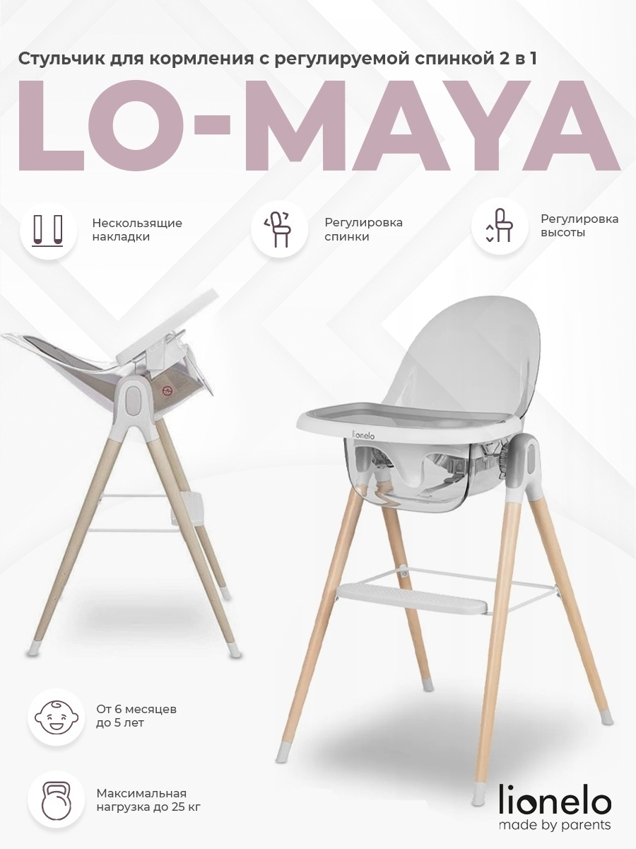 Стульчик для кормления Lionelo Maya (Лионело Мая) - стул для ребенка от 6 месяцев до 25 кг с интересным функционалом. Стул обязательно понравится родителям, которые ценят качественные и практичные вещи. Модель представляет собой пластиковый полупрозрачный стул с мягким съемным матрасиком и буковыми ножками. Ножки имеют регулировку по высоте, что позволит использовать стул для кормления ребенка или для игр и занятий малыша. Так же на "низкий" стульчик можно установить полозья для качания, превратив его в кресло-качалку.