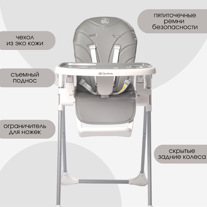 Стульчик для кормления Mr Sandman REEF (С1) - практичный, легкий стульчик с обивкой из эко кожи и скрытыми задними колесами. Легко регулируется по высоте, наклону спинки и подножки.