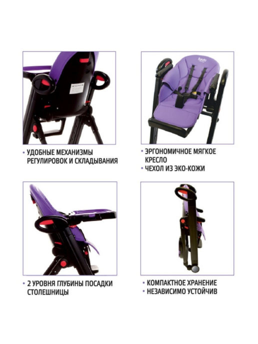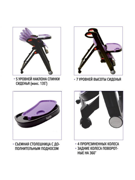 Большое количество индивидуальных настроек позволяет сделать сидение максимальным комфортным для малыша по мере его роста. Регулируется наклон спинки до почти горизонтального положения (5 уровней), высота стула (7 положений), подножка (три положения), глубина стола (2 положения).