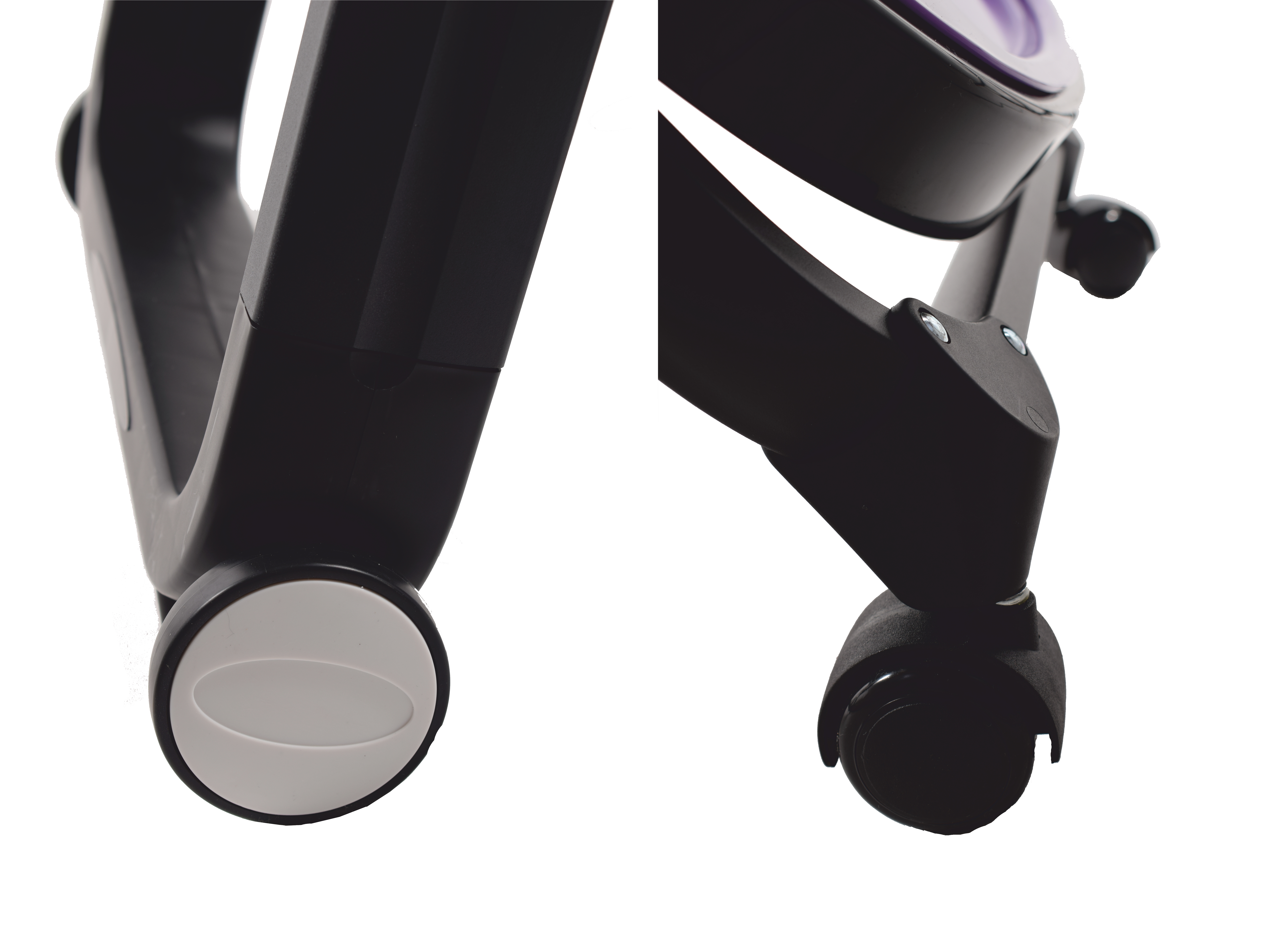 Оснащен 4 колесами, 2 из которых со стопорами. По умолчанию колеса стоят на стопоре, а это значит, что стульчик постоянно пребывает в устойчивом положении, например, ребенок не может откатить его с места, оттолкнувшись ножкой от стола или от стены. Открыть фиксаторы может только взрослый, нажав на боковые кнопки под ручками кресла, что, безусловно, способствует повышенной безопасности.