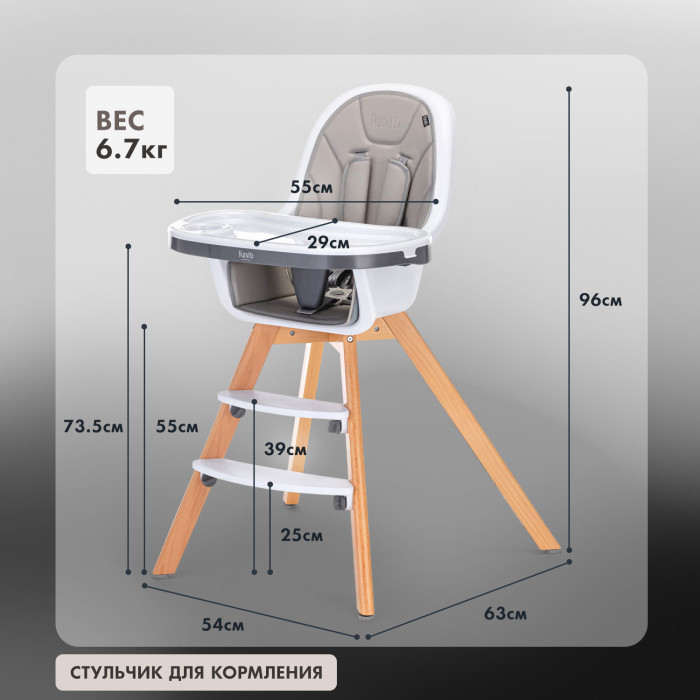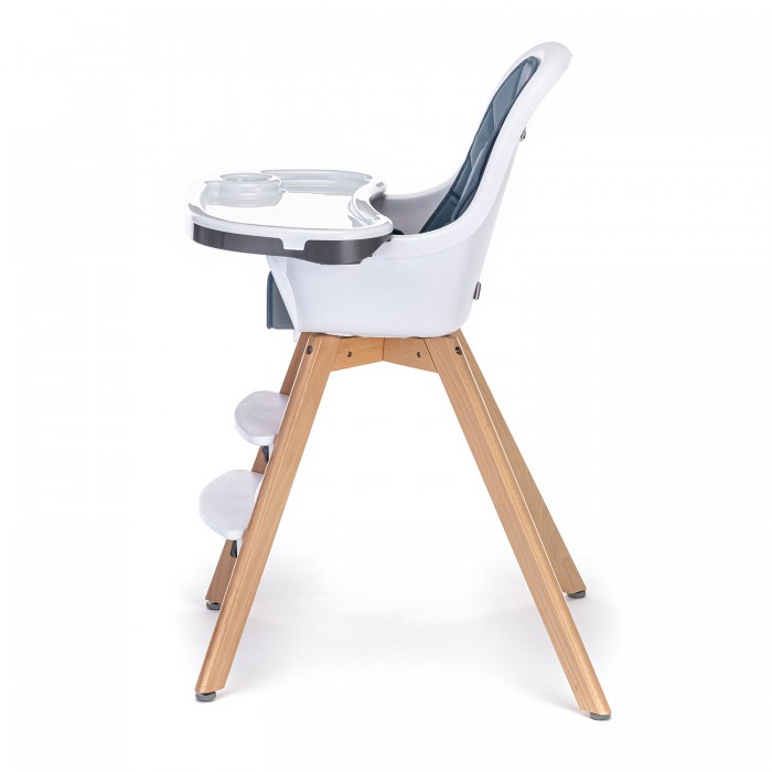 У стульчика два варианта ножек. Высокие ножки 96 см по высоте, позволят удобно кормить ребенка, или придвигать стул к взрослому столу. Небольшие ножки примерно в два раза ниже высоких. Они пригодятся для самостоятельных игр ребенка. Малыш сможет сам залазить на свой стульчик и интересно проводить время. В концы ножек вставляются специальные заклепки для придания устойчивости. Натуральная древесина покрыта эмалью нежного оттенка и водорастворимым лаком, который легко моется и долго сохраняет эффектный внешний вид.
